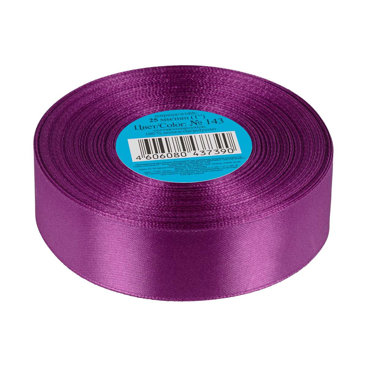 Лента атласная 1-сторонняя 25.0 мм / 33±2 метра, №143 фиолетовый, в термоплёнке, Gamma