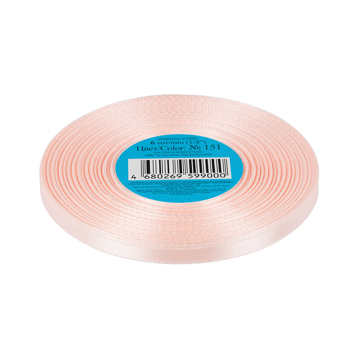 Лента атласная 1-сторонняя 6.0 мм / 33±2 метра, №151 бледно-розовый, в термоплёнке, Gamma