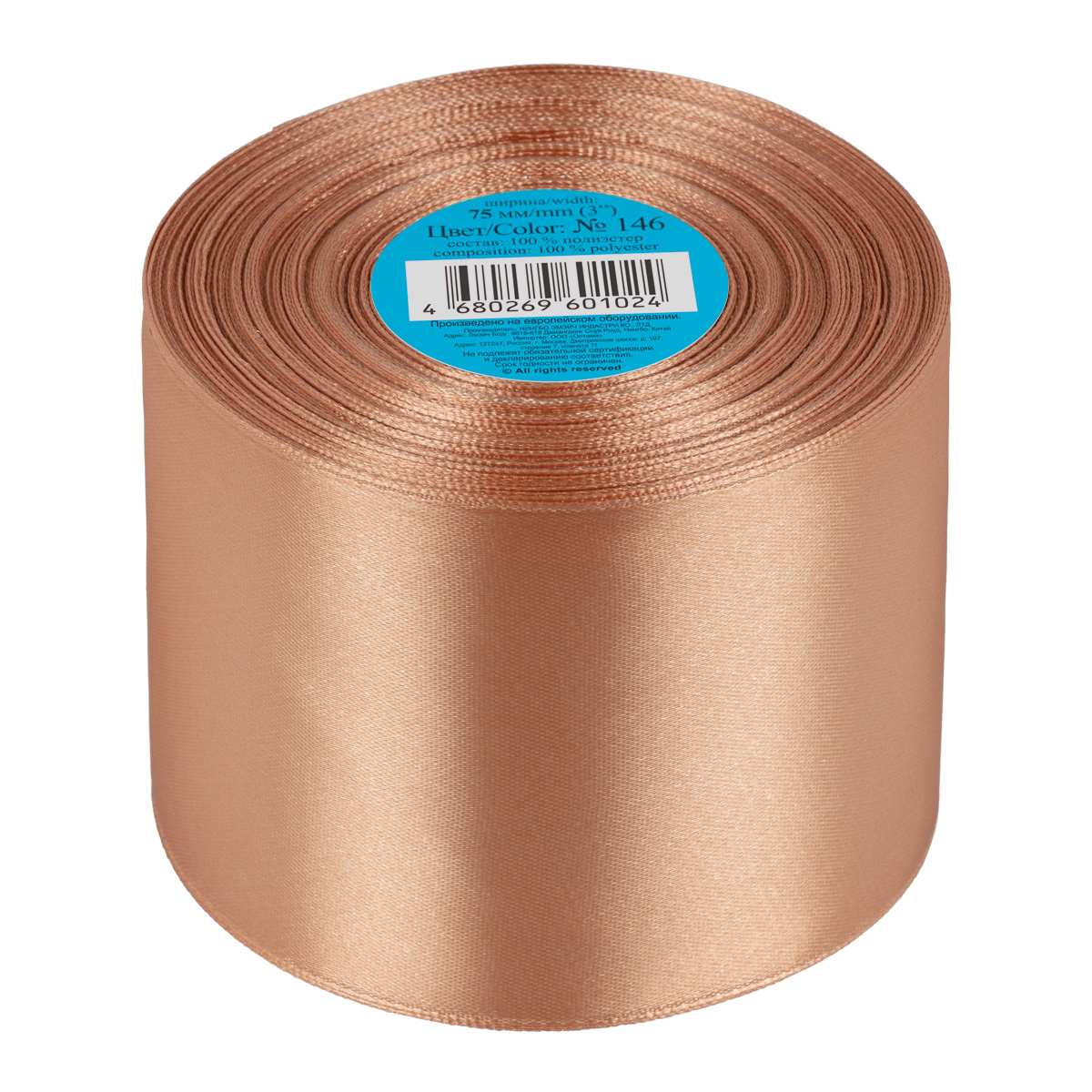 Лента атласная 1-сторонняя 75.0 мм / 33±2 метра, №146 пепельно-каштановый, в термоплёнке, Gamma