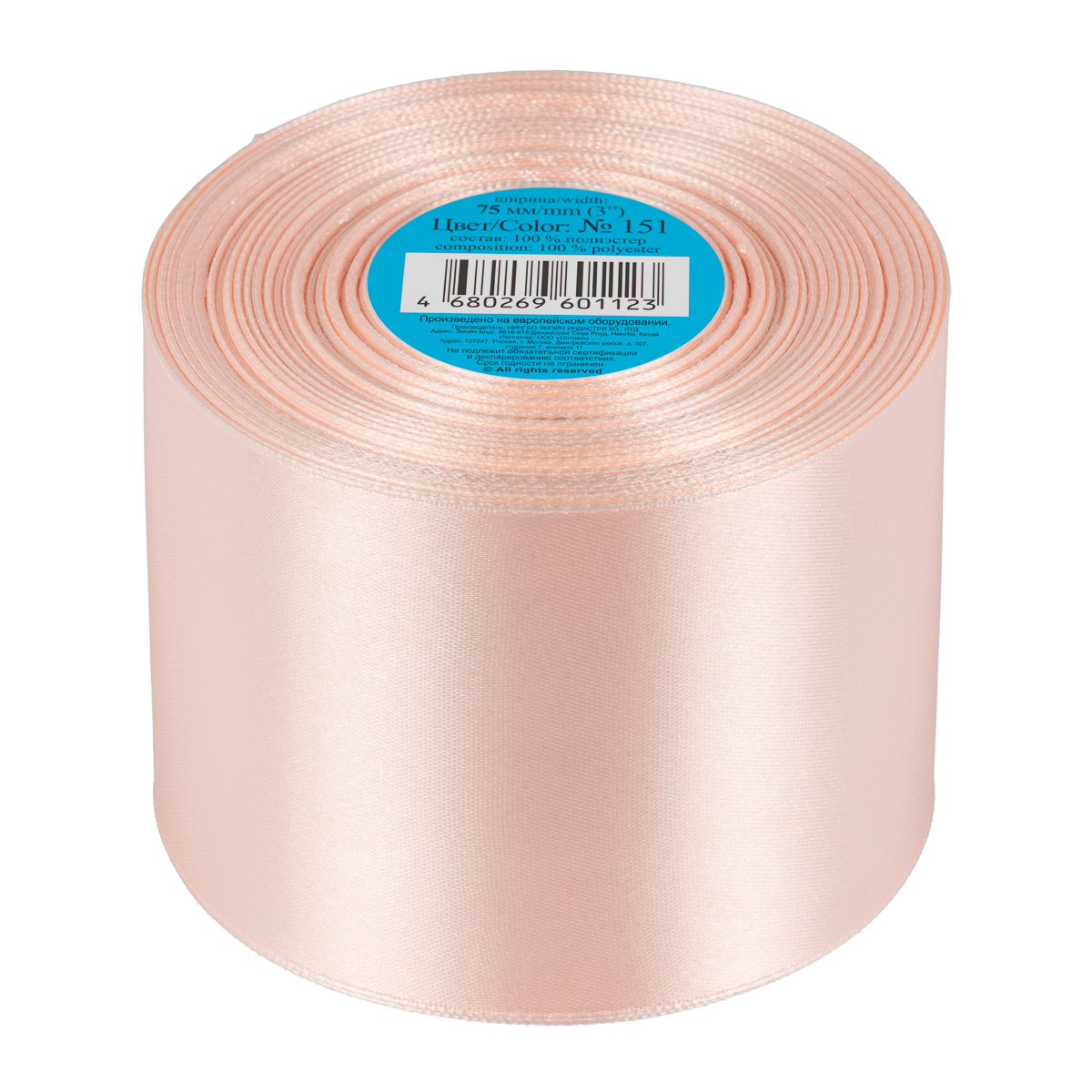 Лента атласная 1-сторонняя 75.0 мм / 33±2 метра, №151 бледно-розовый, в термоплёнке, Gamma