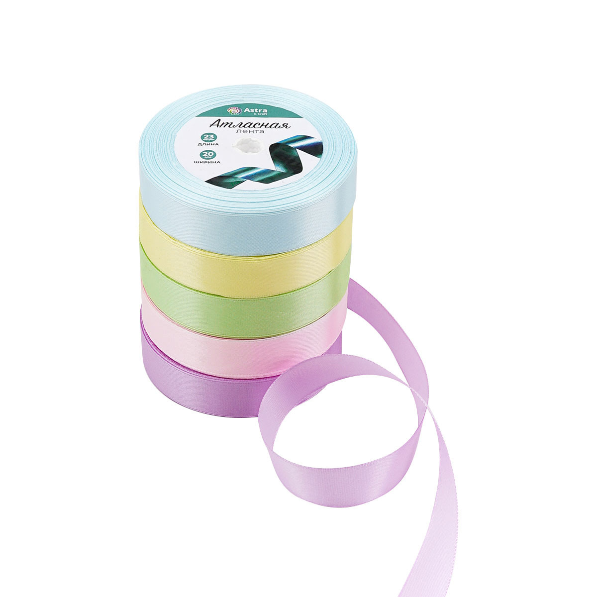 Набор атласных лент 5 цветов по 23.0 мм / 23 метра, пастельный микс