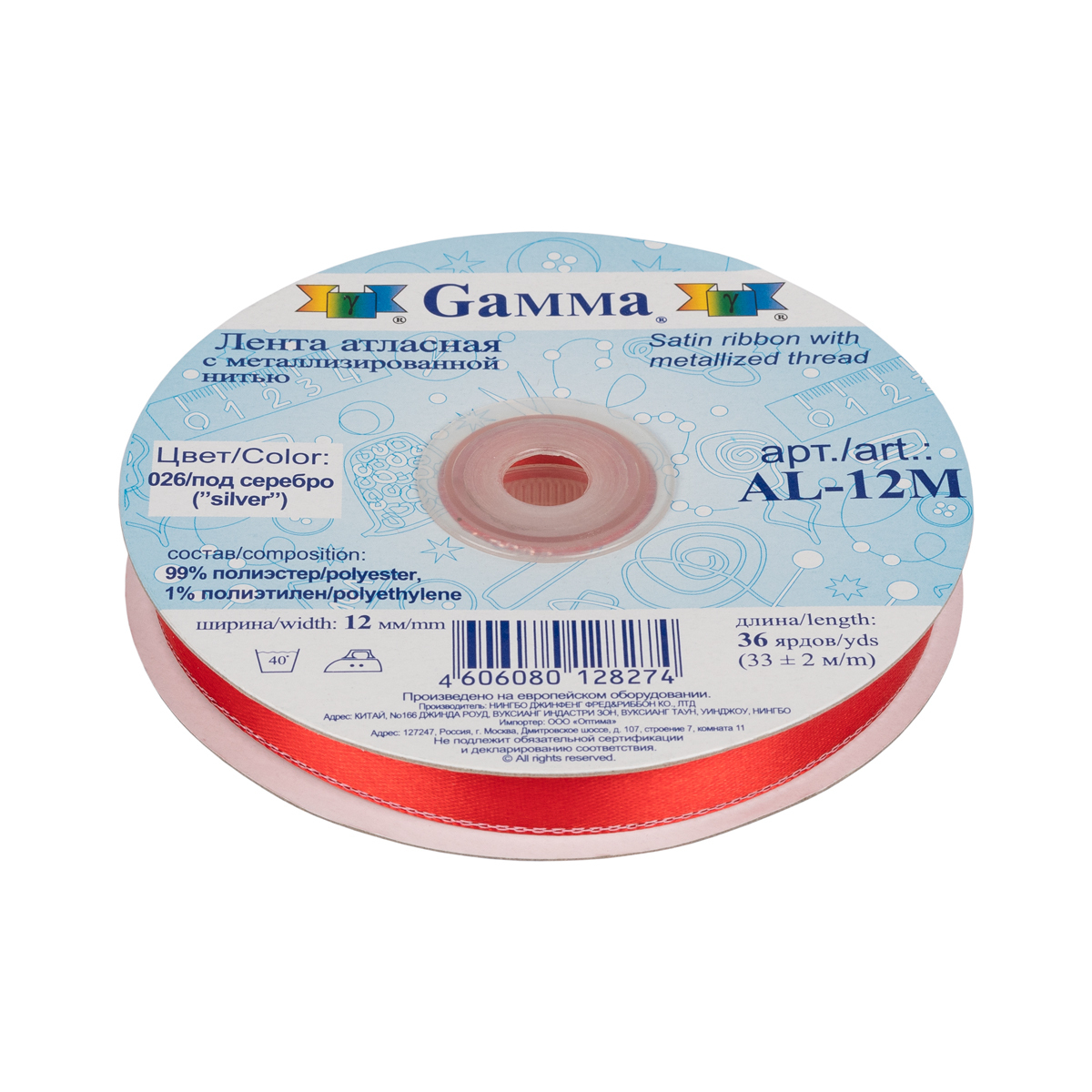 Лента атласная 2-сторонняя с метанитью 12.0 мм / 33±2 метра, 026 красный/серебро, Gamma AL-12M