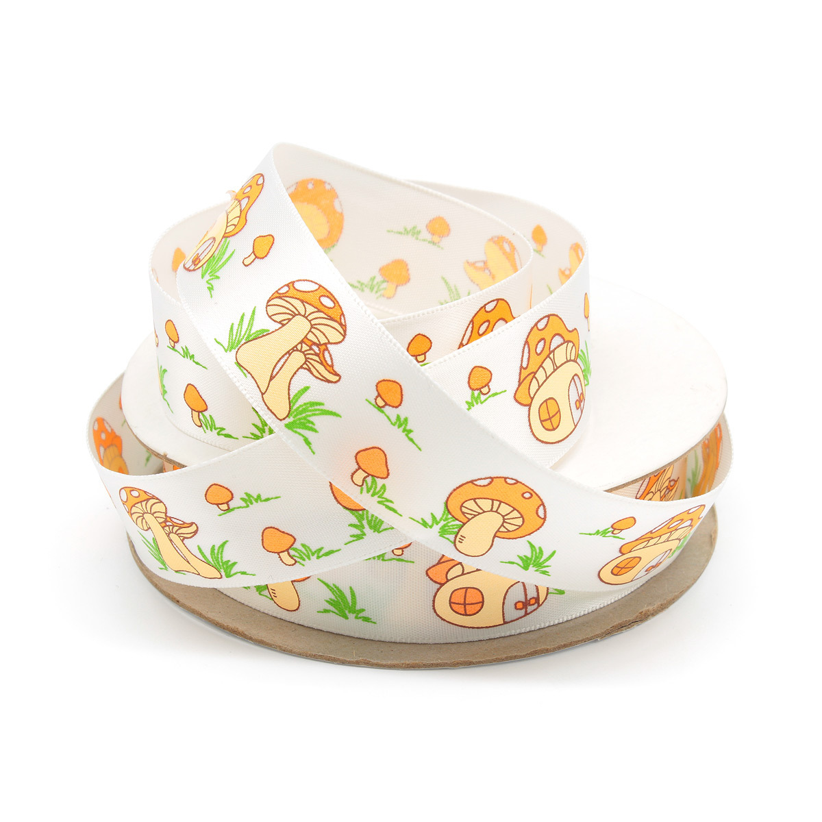 Лента атласная с надписью 22.0 мм / 22.5±1 метров, Грибы, 029 белый, Globus