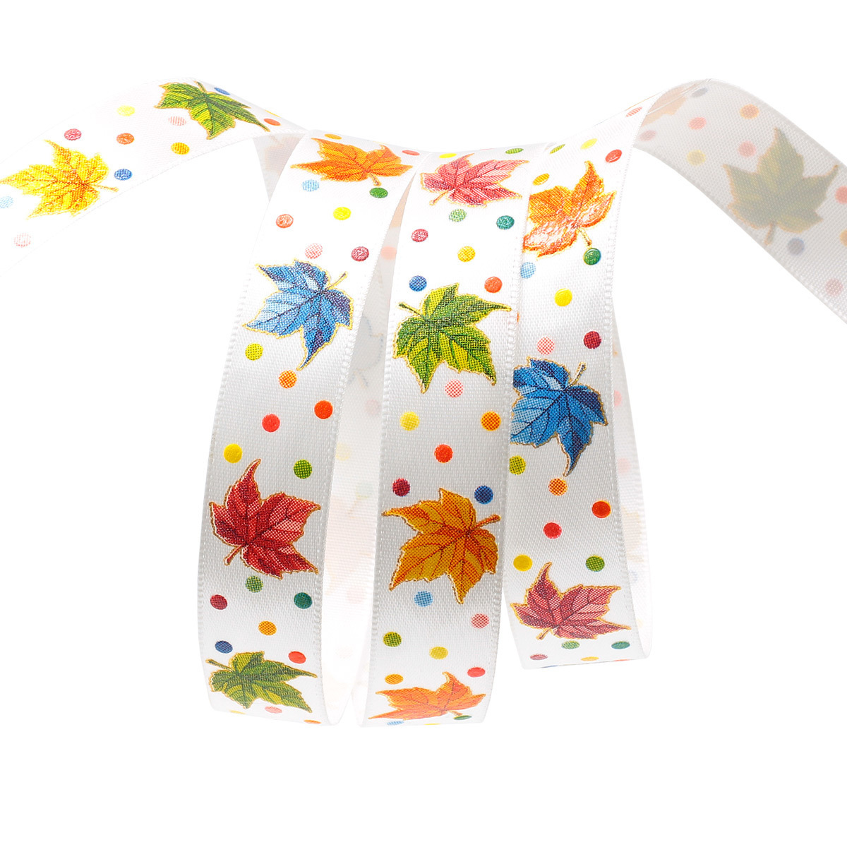 Лента атласная с надписью 16.0 мм / 22.5±1 метров, Кленовые листья, A2-001 белый, Globus