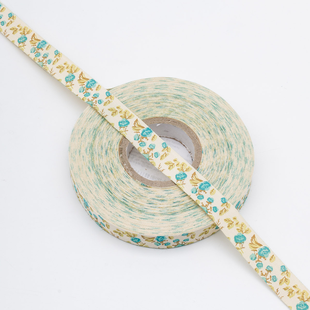Лента декоративная х/б Цветы 15.0 мм / 25±1 метров, бело-бирюзовый, 3448