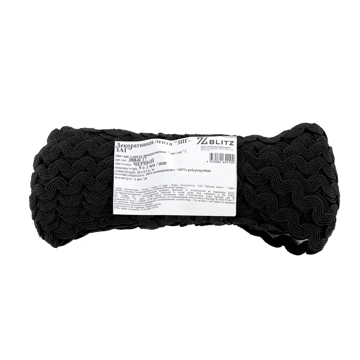 Тесьма отделочная зигзаг 9 мм, / 20 метров, черный, Blitz