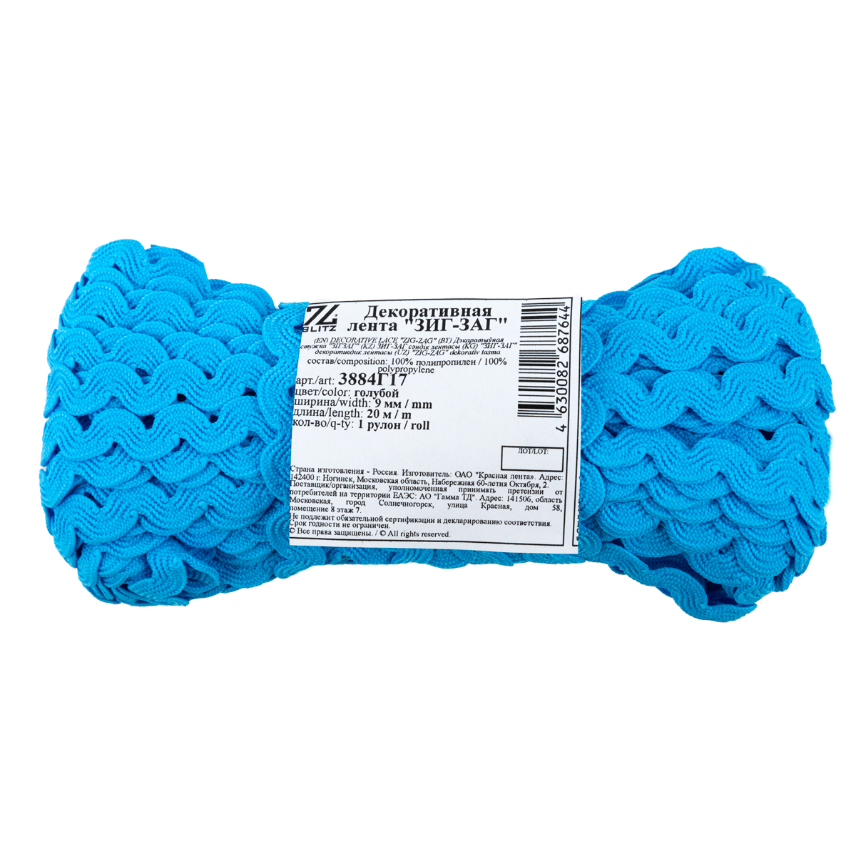 Тесьма отделочная зигзаг 9 мм, / 20 метров, голубой, Blitz