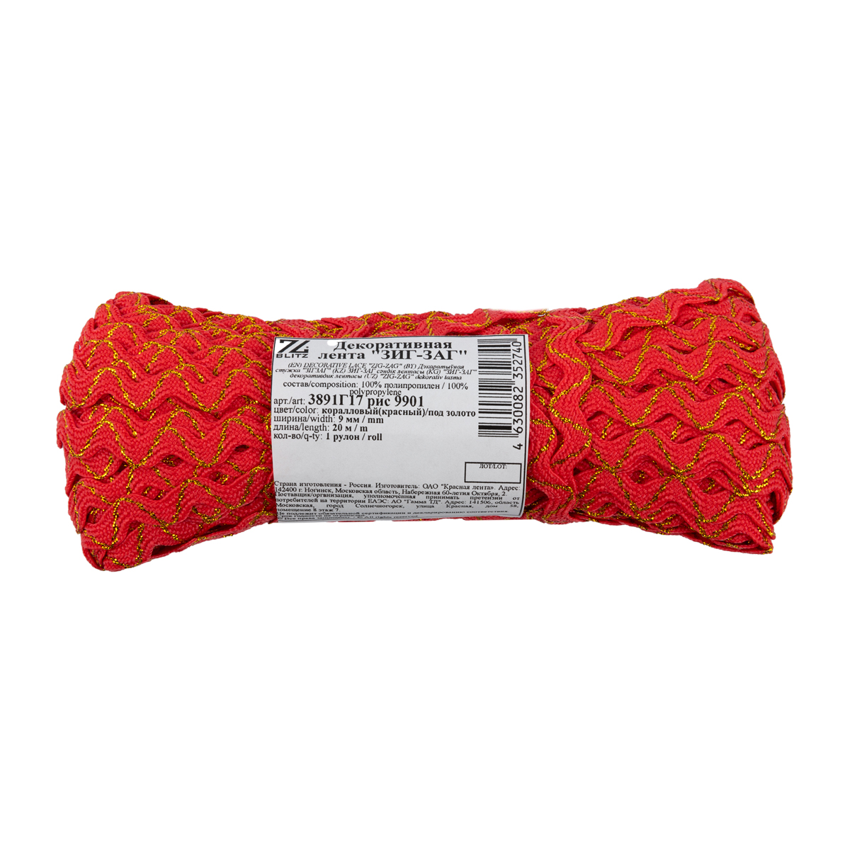 Тесьма отделочная зигзаг 9 мм, / 20 метров, коралловый(красный)/под золото, Blitz