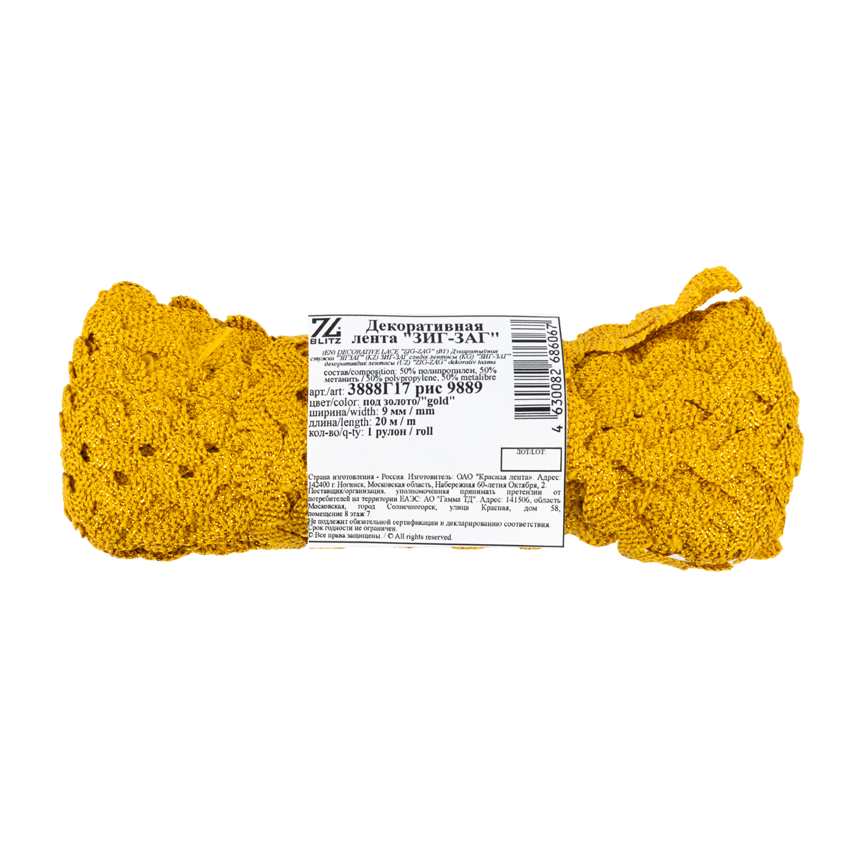 Тесьма отделочная зигзаг 9 мм, / 20 метров, под золото/gold, Blitz