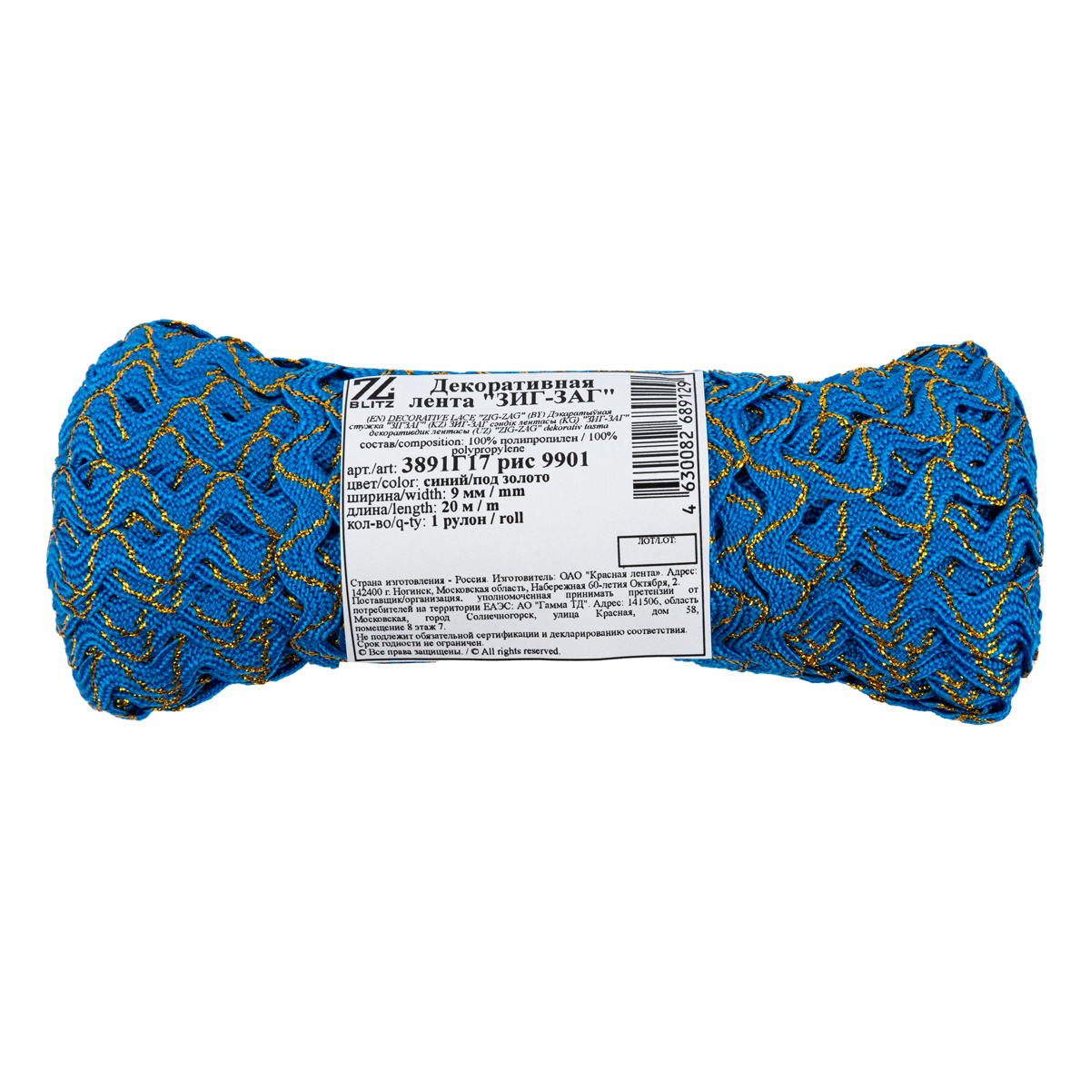 Тесьма отделочная зигзаг 9 мм, / 20 метров, синий/под золото, Blitz