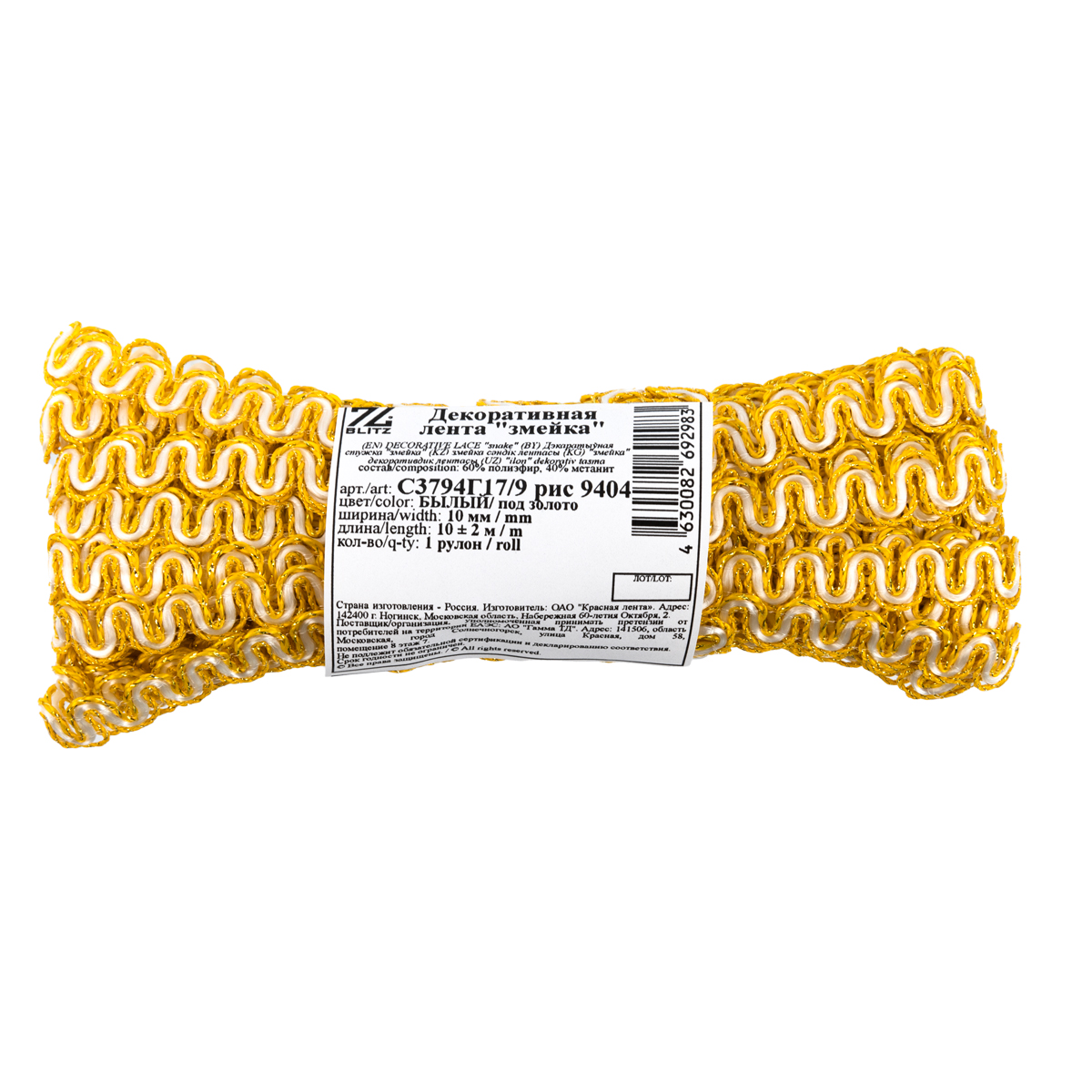 Тесьма декоративная 10 мм / 10 метров, метал. рис. 8657, БЫЛЫЙ/ под золото, Blitz