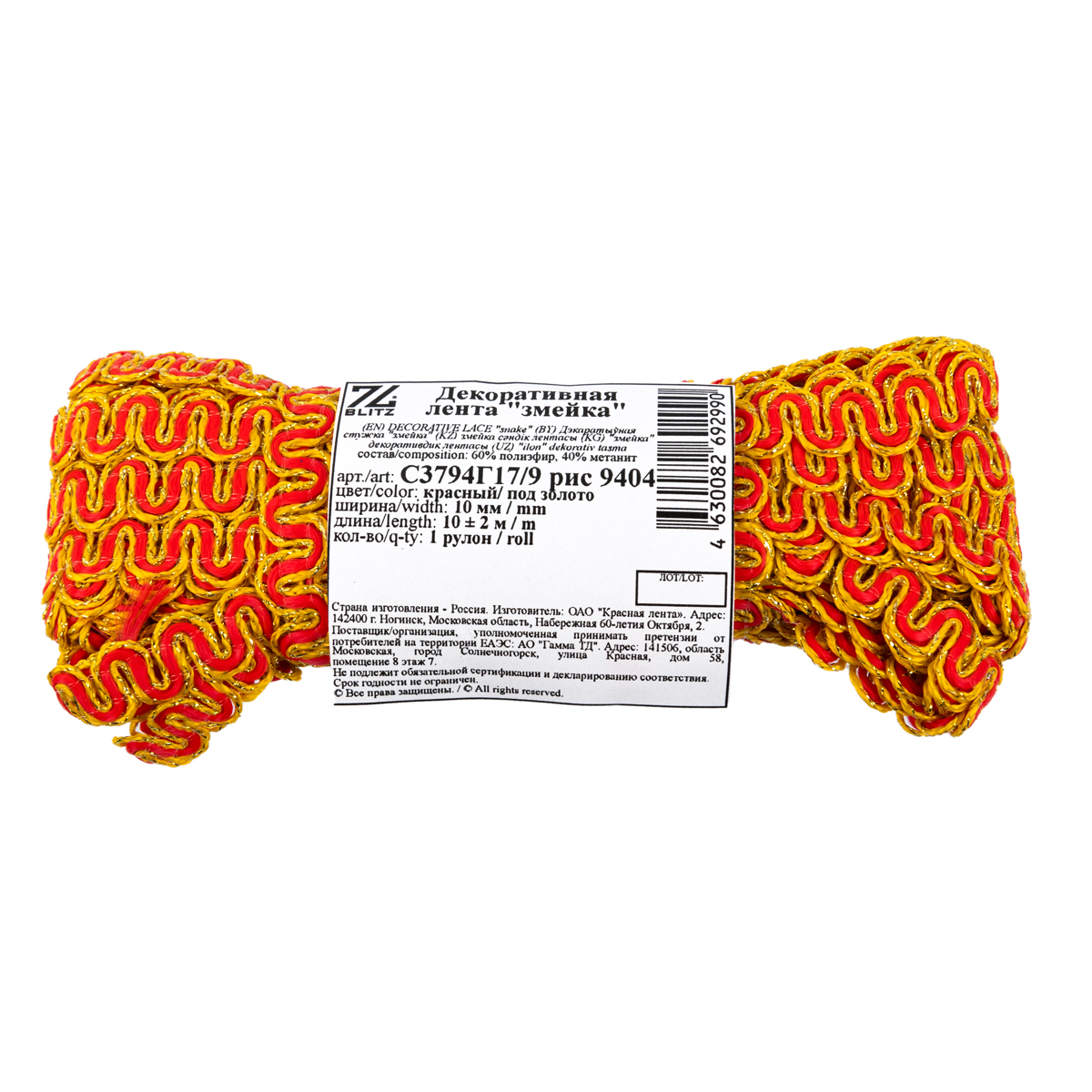 Тесьма декоративная 10 мм / 10 метров, метал. рис. 8657, красный/ под золото, Blitz