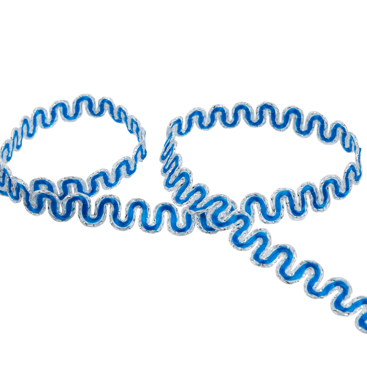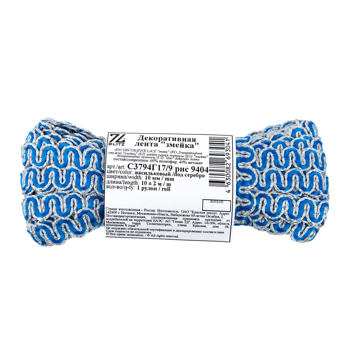 Тесьма декоративная 10 мм / 10 метров, метал. рис. 8657, васильковый /под серебро, Blitz