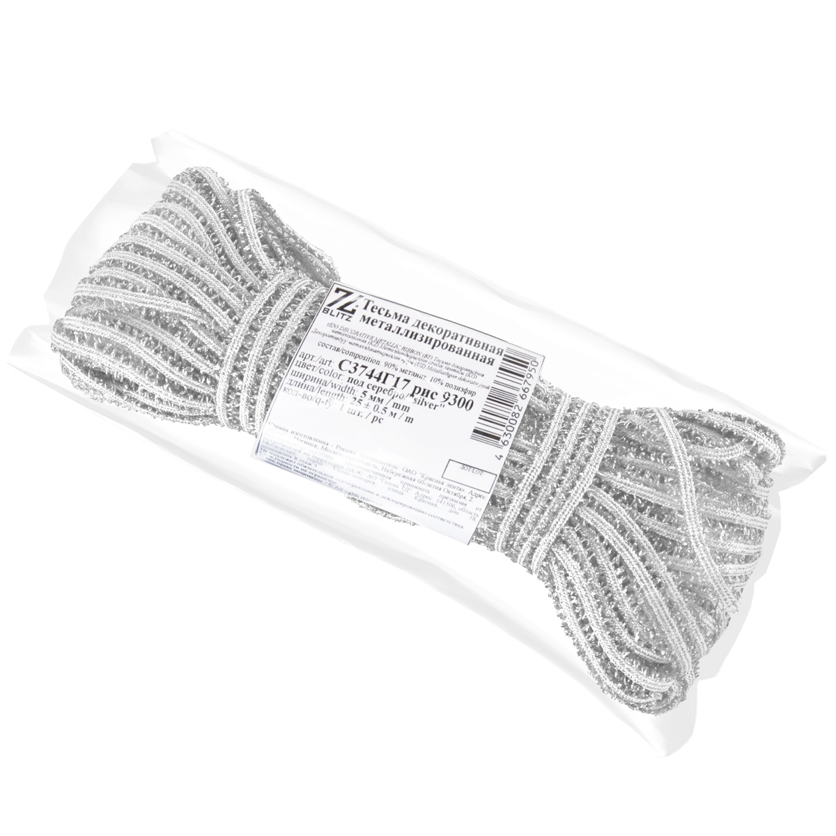 Тесьма отделочная сороконожка 5.0 мм, / 25±0.5 метров, метанит, под серебро/silver, Blitz
