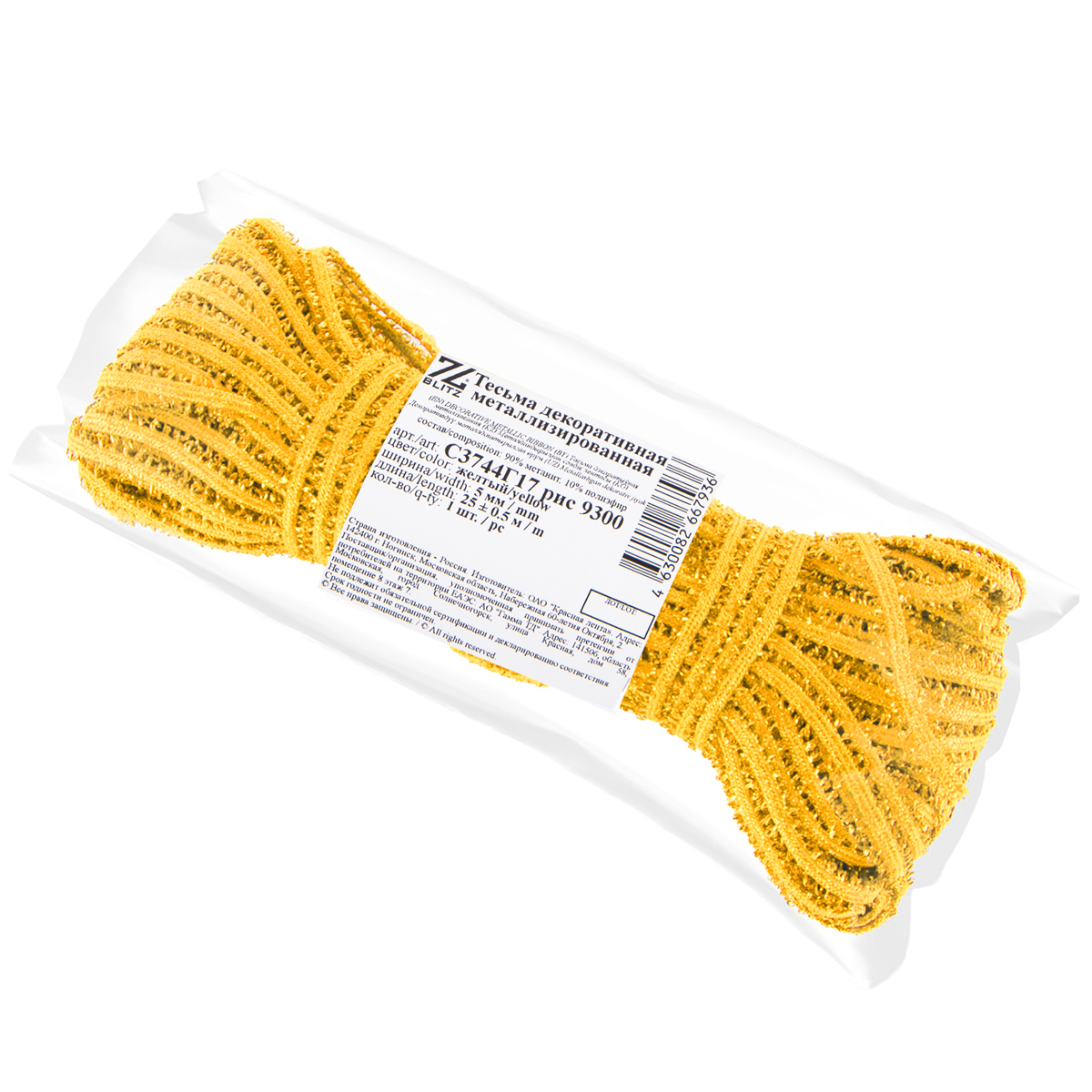 Тесьма отделочная сороконожка 5.0 мм, / 25±0.5 метров, метанит, желтый/yellow, Blitz