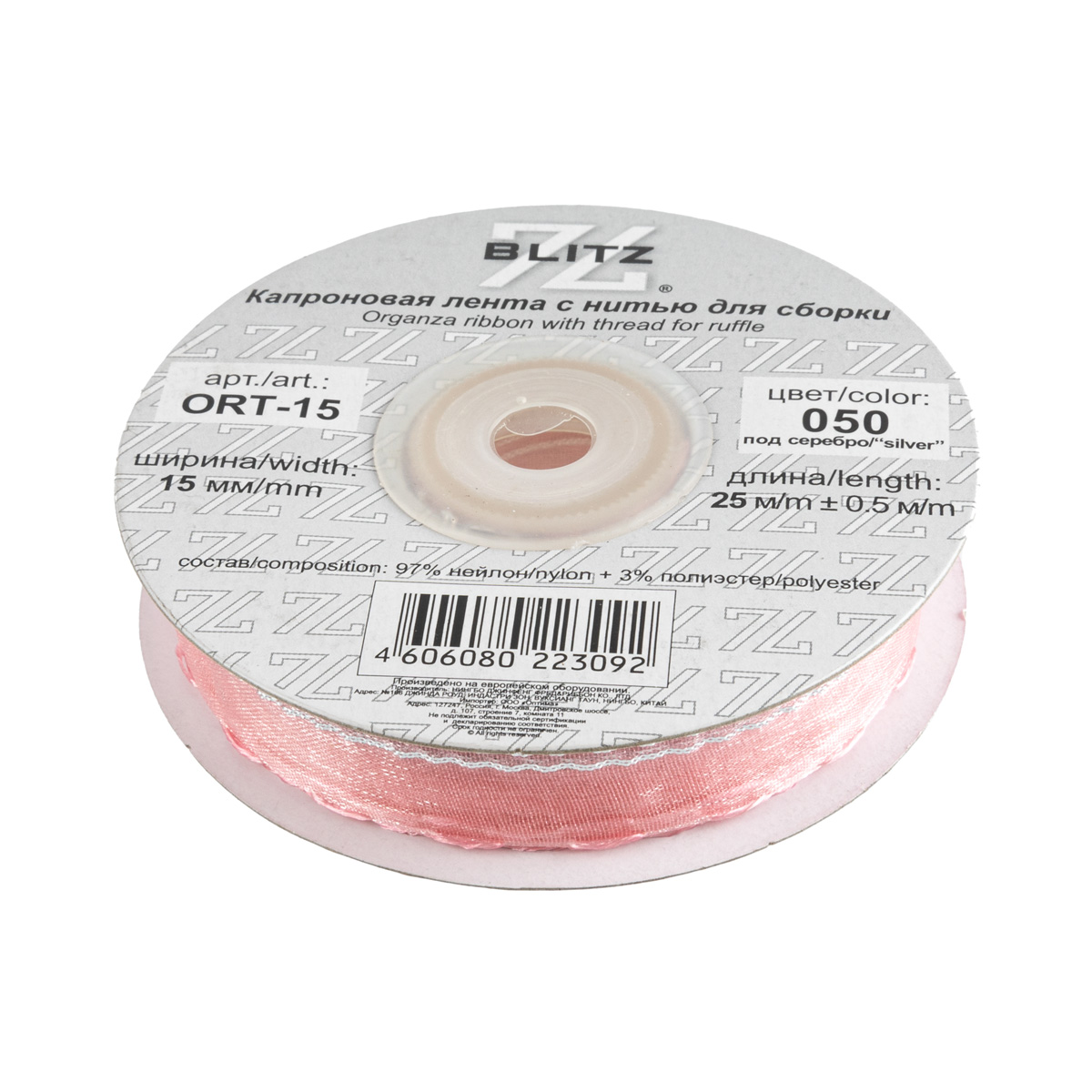 Лента капроновая (органза) 15.0 мм / 25 метров, 050 бл. розовый/серебро, Blitz ORT-15