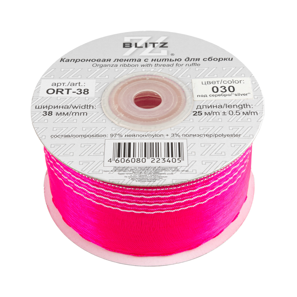 Лента капроновая (органза) 38.0 мм / 25 метров, 030 т.розовый/серебро, Blitz ORT-38