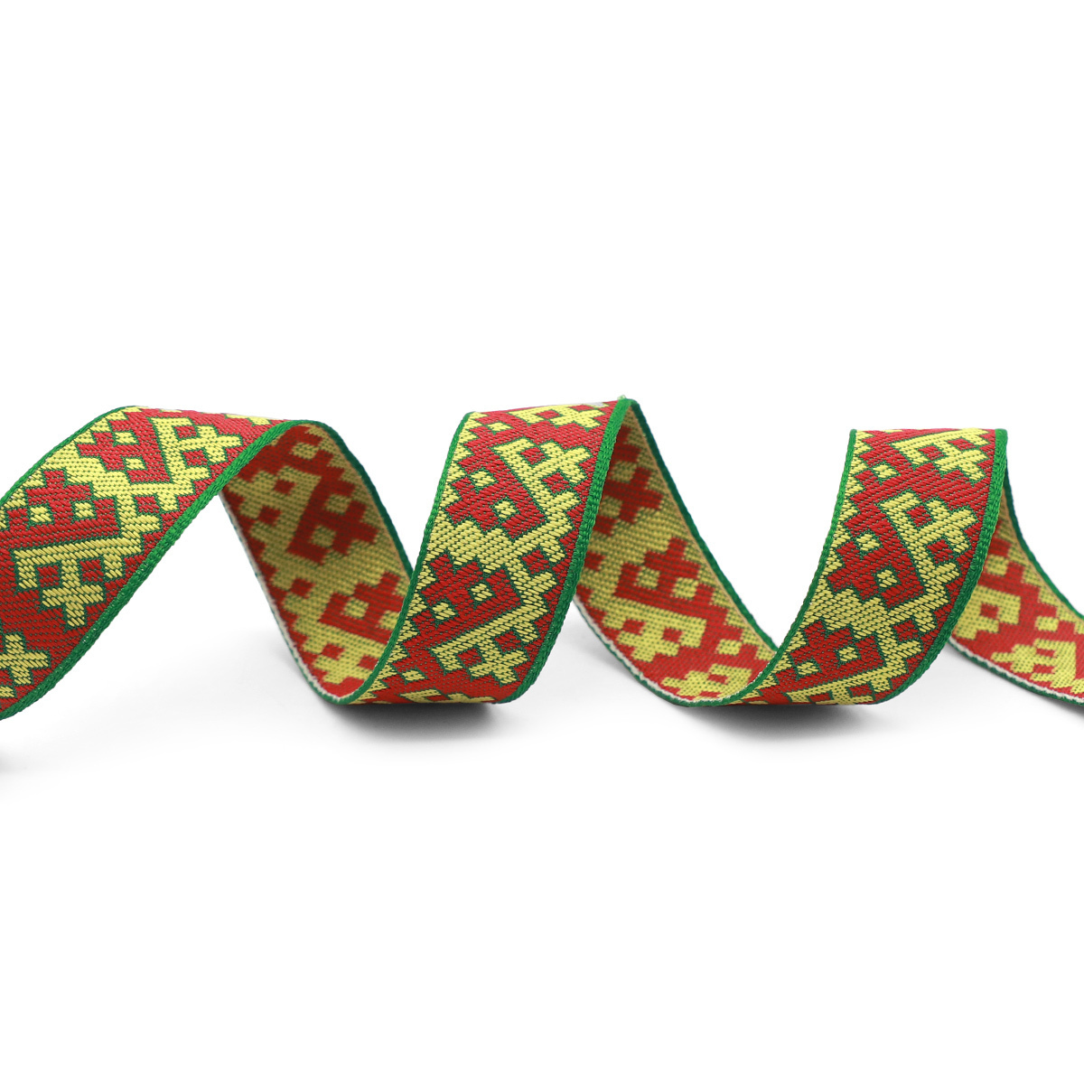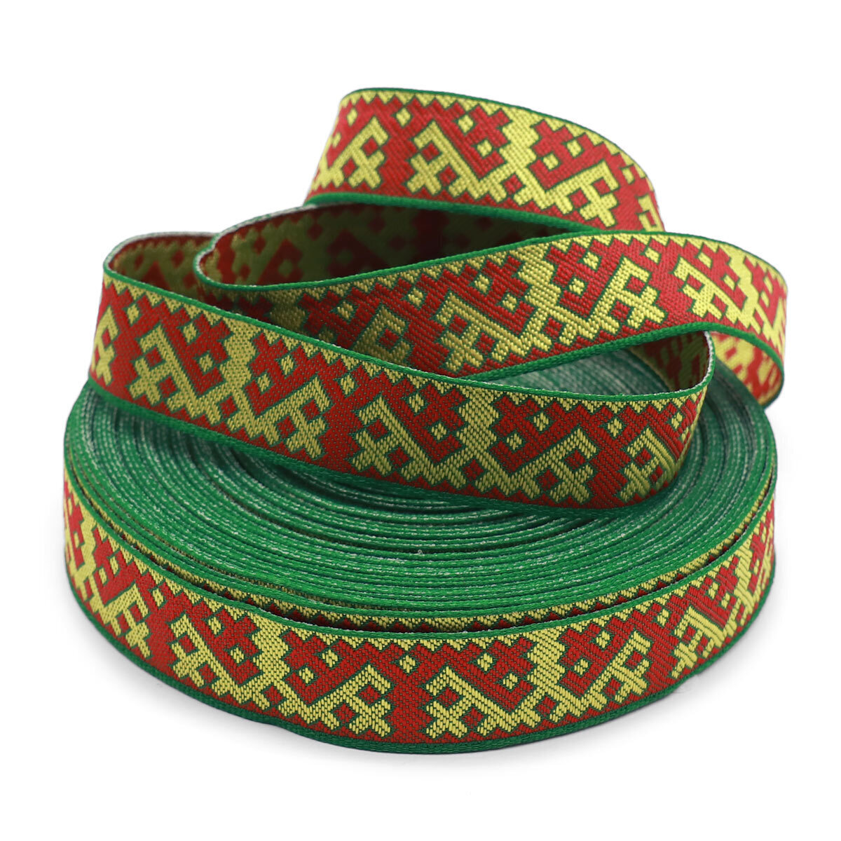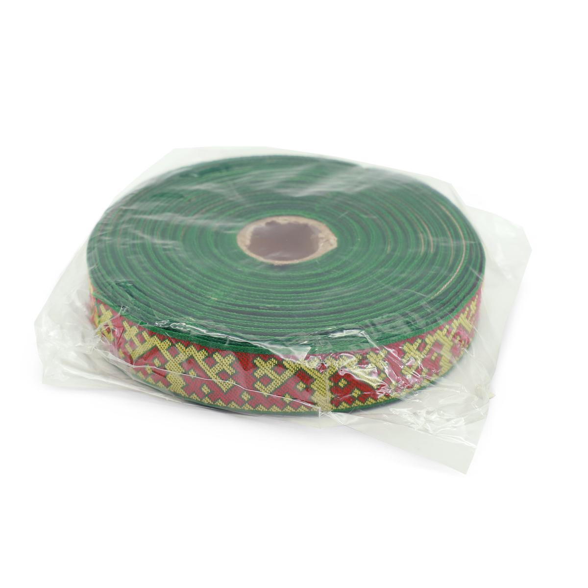 Лента (тесьма) жаккардовая 24.0 мм / 25±1 метров, Орнаменты и узоры народов севера, рис. 9685 (5 зеленый/желтый/красный) С3772Г17