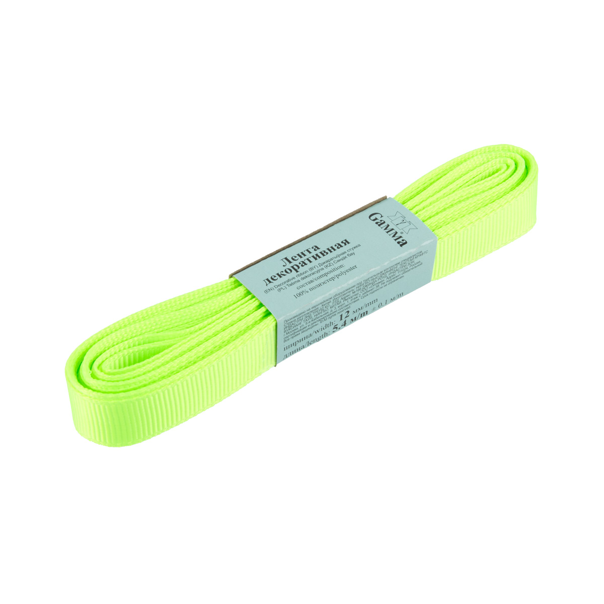 Лента репсовая нарезка 12.0 мм / 10 шт по 5.4 метра, 013 лайм, Gamma GR-12
