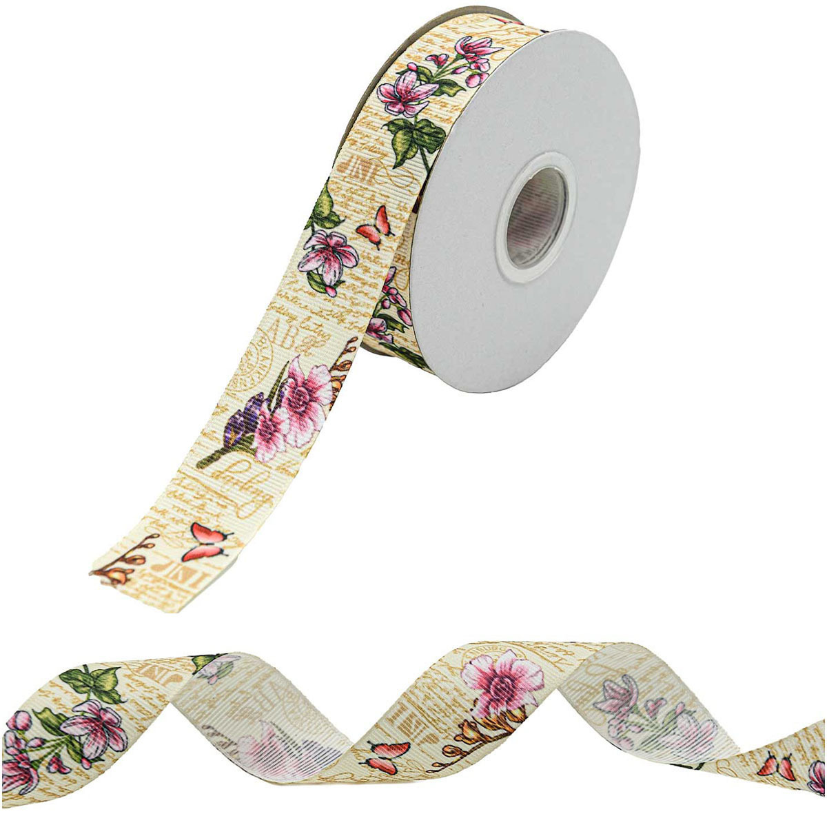 Лента репсовая (в рубчик) Цветы и бабочки 25 мм, 22.86 м
