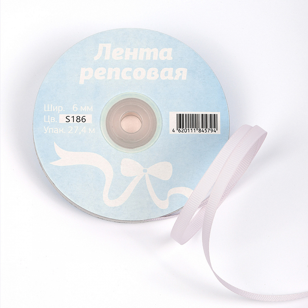 Лента репсовая (в рубчик) 6.0 мм, S186 св.серый уп. 27,4м