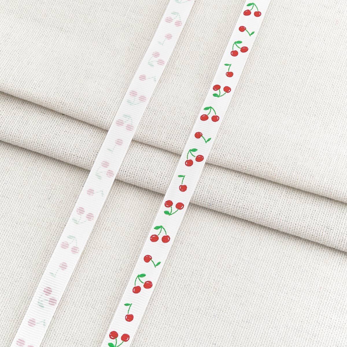 Лента репсовая (в рубчик) с принтом 10.0 мм / 45.72 метра, Вишенки 1012 белый
