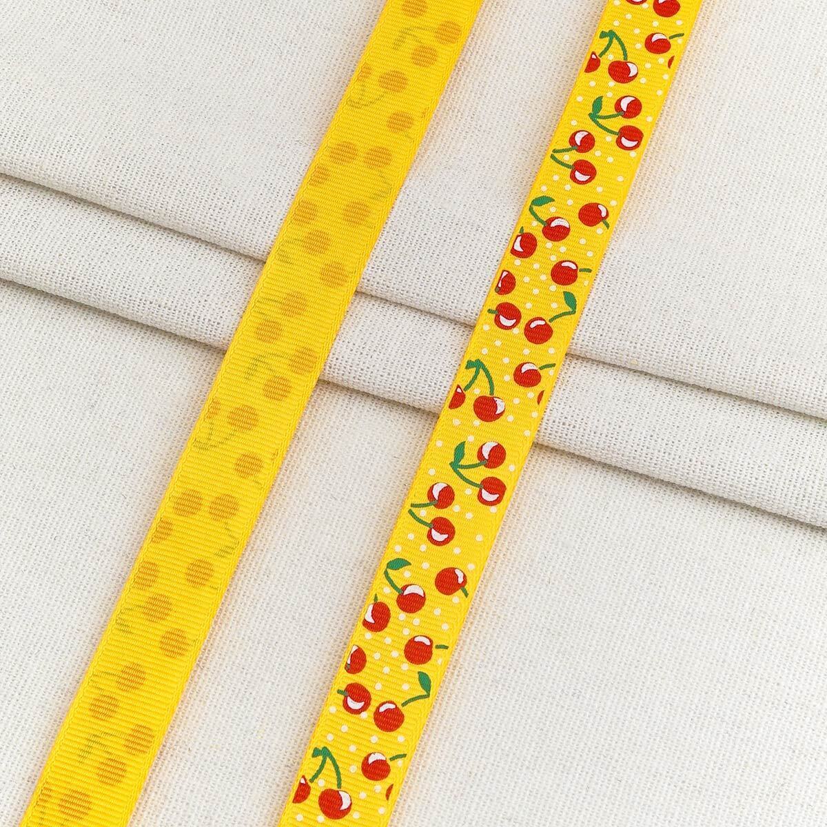 Лента репсовая (в рубчик) с принтом 15.0 мм / 45.72 метра, Вишенки 1507 желтый