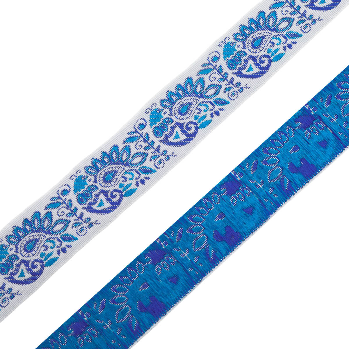Жаккардовая лента – это плотный материал, на котором прямо в процессе производства по специальной технологии вытканы объемные узоры или рисунки, отдаленно напоминающие вышивку. Поскольку рисунок образуется переплетением нитей, а не наносится на готовую ткань, он никогда не поблекнет и не сотрется. Эта тесьма отлично подходит для украшения домашнего текстиля – покрывал, наволочек, мебельных чехлов, сувенирной атрибутики и многого другого. Кроме того, такие ленты можно пришивать как ручки для сумок и рюкзаков, подвязок, подтяжек и ремней. Материал порадует вас отличным качеством, разнообразием расцветок и простотой использования.