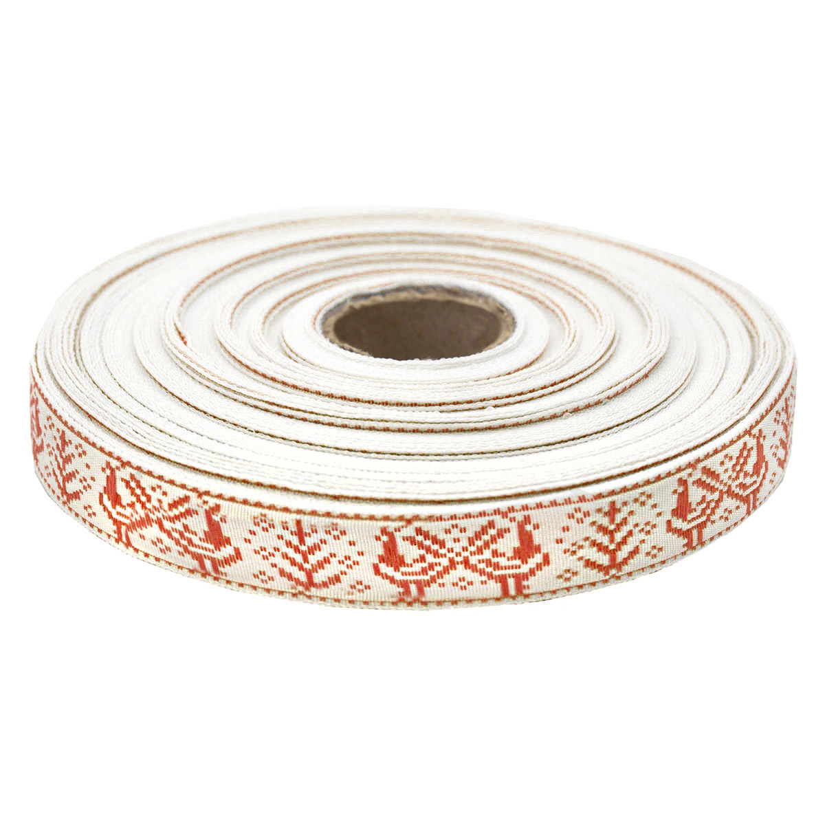 Жаккардовая лента имеет объемный плетеный узор, напоминающий вышивку. Поскольку рисунок образуется переплетением нитей, а не наносится на готовую ткань, он никогда не поблекнет и не сотрется. Применение: – украшение домашнего текстиля – покрывал, наволочек, мебельных чехлов; – отделка и ремонт предметов одежды, особенно одежды для выступлений; – такие ленты можно пришивать как ручки для сумок и рюкзаков, подвязок, подтяжек и ремней. Чтобы пришить жаккардовую ленту к материалу, используйте простую машинную строчку. Размер: ширина 18 мм, длина 25 м.