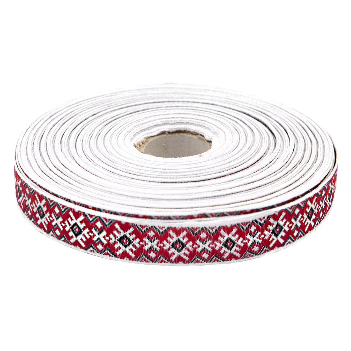 Лента (тесьма) жаккардовая 18.0 мм / 25±1 метров, Славянский орнамент Оберег, рис.9651 (2 белый/красный/черный) С3771Г17