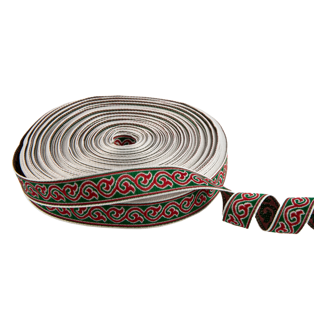Лента (тесьма) жаккардовая 18.0 мм / 25 метров, Орнамент для северных народов, рис 9594 белый/зеленый/красный (№1), Gamma С3771