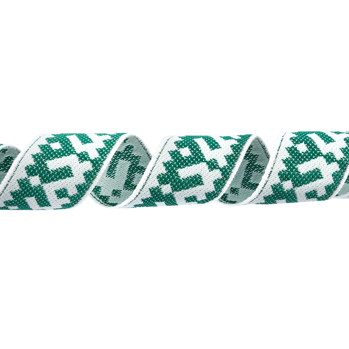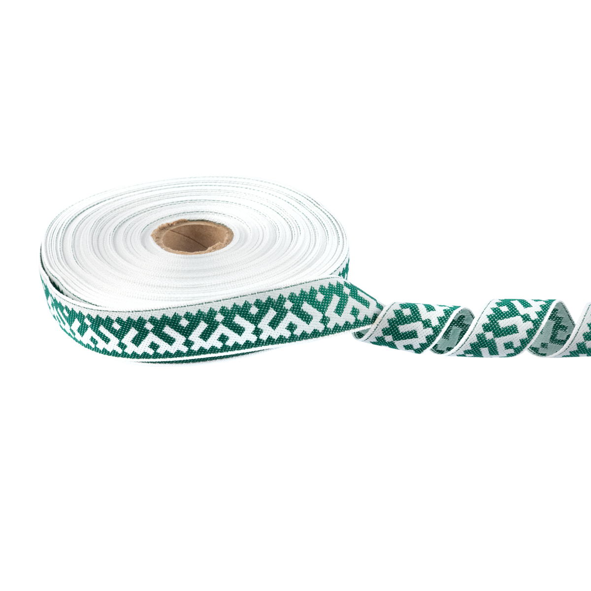 Лента (тесьма) жаккардовая 24.0 мм / 25 метров, Орнамент для северных народов, рис 9674 белый/т.зеленый, Gamma С3772