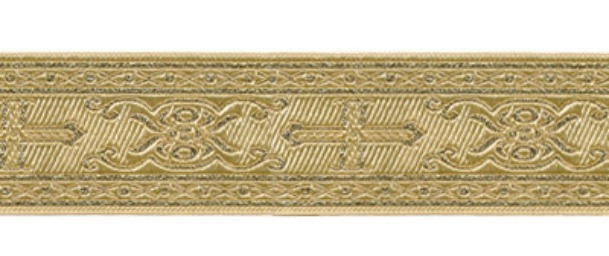 Жаккардовая лента с церковным орнаментом - это лента с рисунком, который не наносится сверху, а образуется плетением нитей самой тесьмы, и благодаря этому никогда не сотрется и не поблекнет. Жаккардовая лента выглядит как вышивка гладью, и придает фольклорный колорит любому изделию. Используется в качестве декоративного элемента при производстве одежды, художественных изделий.