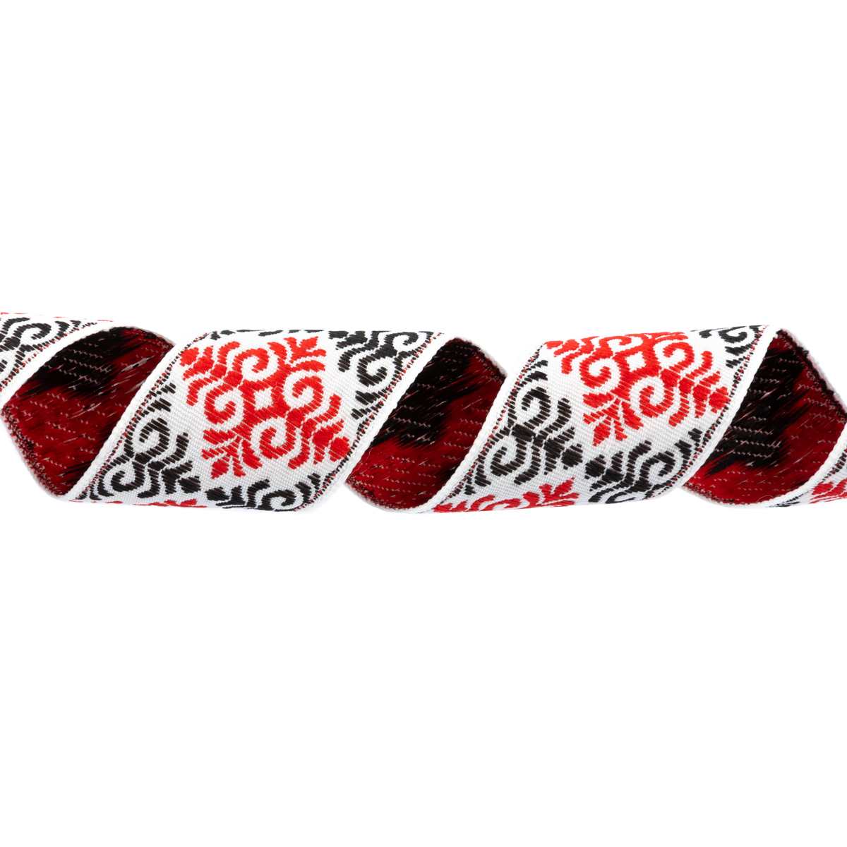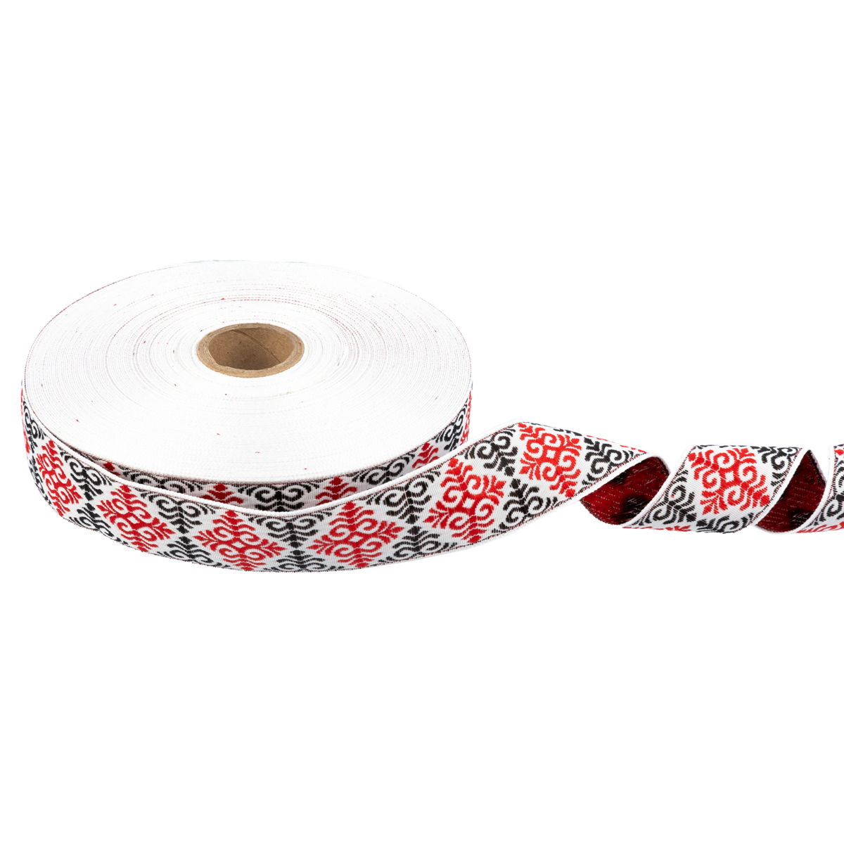 Лента (тесьма) жаккардовая 32.0 мм / 25 метров, Орнамент для северных народов, рис 9788 белый-красный-черный, Gamma С3774