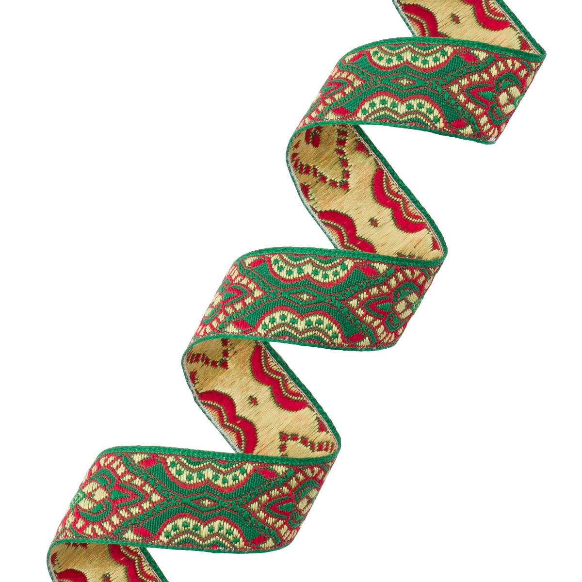 Жаккардовая лента имеет объемный плетеный узор, напоминающий вышивку. Поскольку рисунок образуется переплетением нитей, а не наносится на готовую ткань, он никогда не поблекнет и не сотрется. Металлизированные нити придают ленте нарядный блеск и торжественность. Применение: – украшение домашнего текстиля – покрывал, наволочек, мебельных чехлов; – отделка и ремонт предметов одежды, особенно одежды для выступлений; – такие ленты можно пришивать как ручки для сумок и рюкзаков, подвязок, подтяжек и ремней. Чтобы пришить жаккардовую ленту к материалу, используйте простую машинную строчку. Размер: ширина 24 мм, длина 25 м.