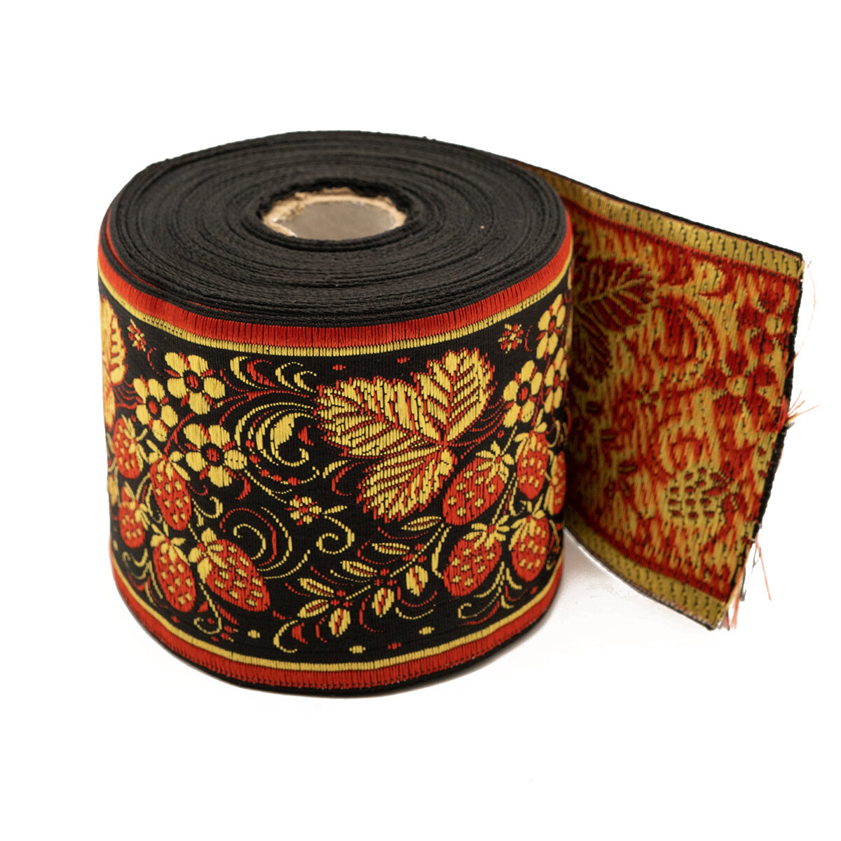 Жаккардовая лента имеет объемный плетеный узор, напоминающий вышивку. Поскольку рисунок образуется переплетением нитей, а не наносится на готовую ткань, он никогда не поблекнет и не сотрется. Металлизированные нити придают ленте нарядный блеск и торжественность. Применение: – украшение домашнего текстиля – покрывал, наволочек, мебельных чехлов; – отделка и ремонт предметов одежды, особенно одежды для выступлений; – такие ленты можно пришивать как ручки для сумок и рюкзаков, подвязок, подтяжек и ремней. Чтобы пришить жаккардовую ленту к материалу, используйте простую машинную строчку. Размер: ширина 90 мм, длина 12,5 м.
