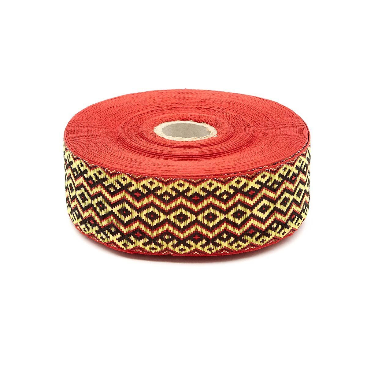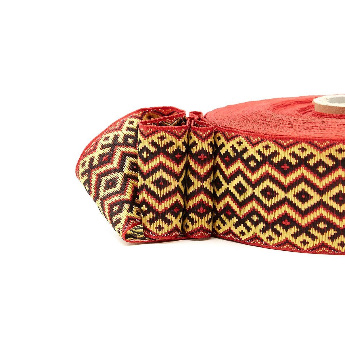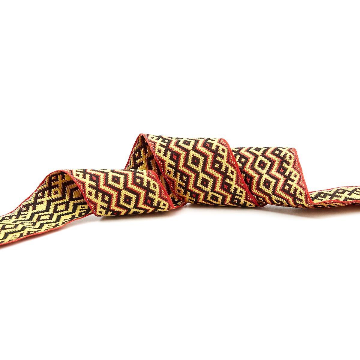 Жаккардовая лента имеет объемный плетеный узор, напоминающий вышивку. Поскольку рисунок образуется переплетением нитей, а не наносится на готовую ткань, он никогда не поблекнет и не сотрется. Применение: – украшение домашнего текстиля – покрывал, наволочек, мебельных чехлов; – отделка и ремонт предметов одежды, особенно одежды для выступлений; – такие ленты можно пришивать как ручки для сумок и рюкзаков, подвязок, подтяжек и ремней. Чтобы пришить жаккардовую ленту к материалу, используйте простую машинную строчку. Размер: ширина 50 мм, длина 25 м.
