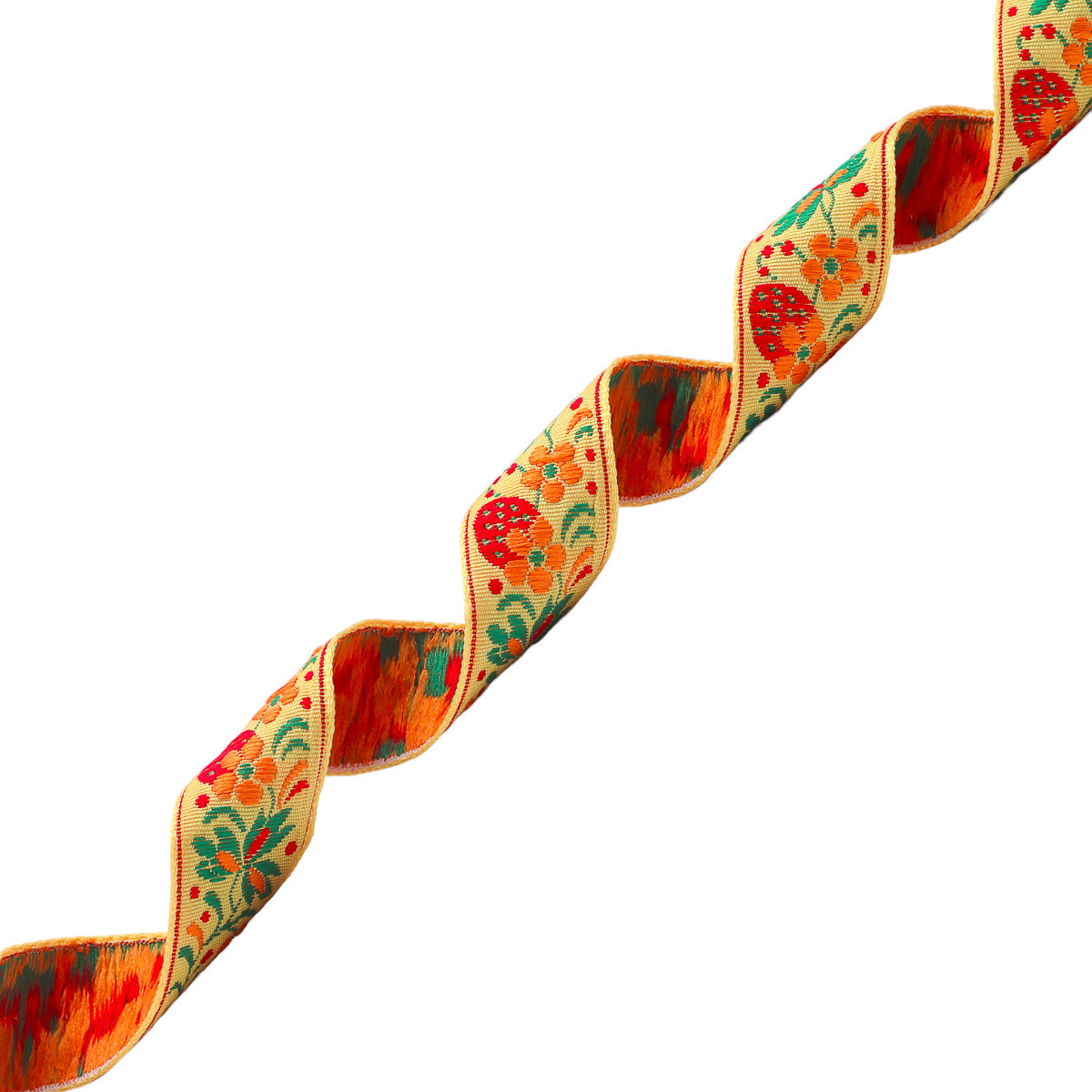 Жаккардовая лента имеет объемный плетеный узор, напоминающий вышивку. Поскольку рисунок образуется переплетением нитей, а не наносится на готовую ткань, он никогда не поблекнет и не сотрется. Применение: – украшение домашнего текстиля – покрывал, наволочек, мебельных чехлов; – отделка и ремонт предметов одежды, особенно одежды для выступлений; – такие ленты можно пришивать как ручки для сумок и рюкзаков, подвязок, подтяжек и ремней. Чтобы пришить жаккардовую ленту к материалу, используйте простую машинную строчку. Размер: ширина 24 мм, длина 25 м.