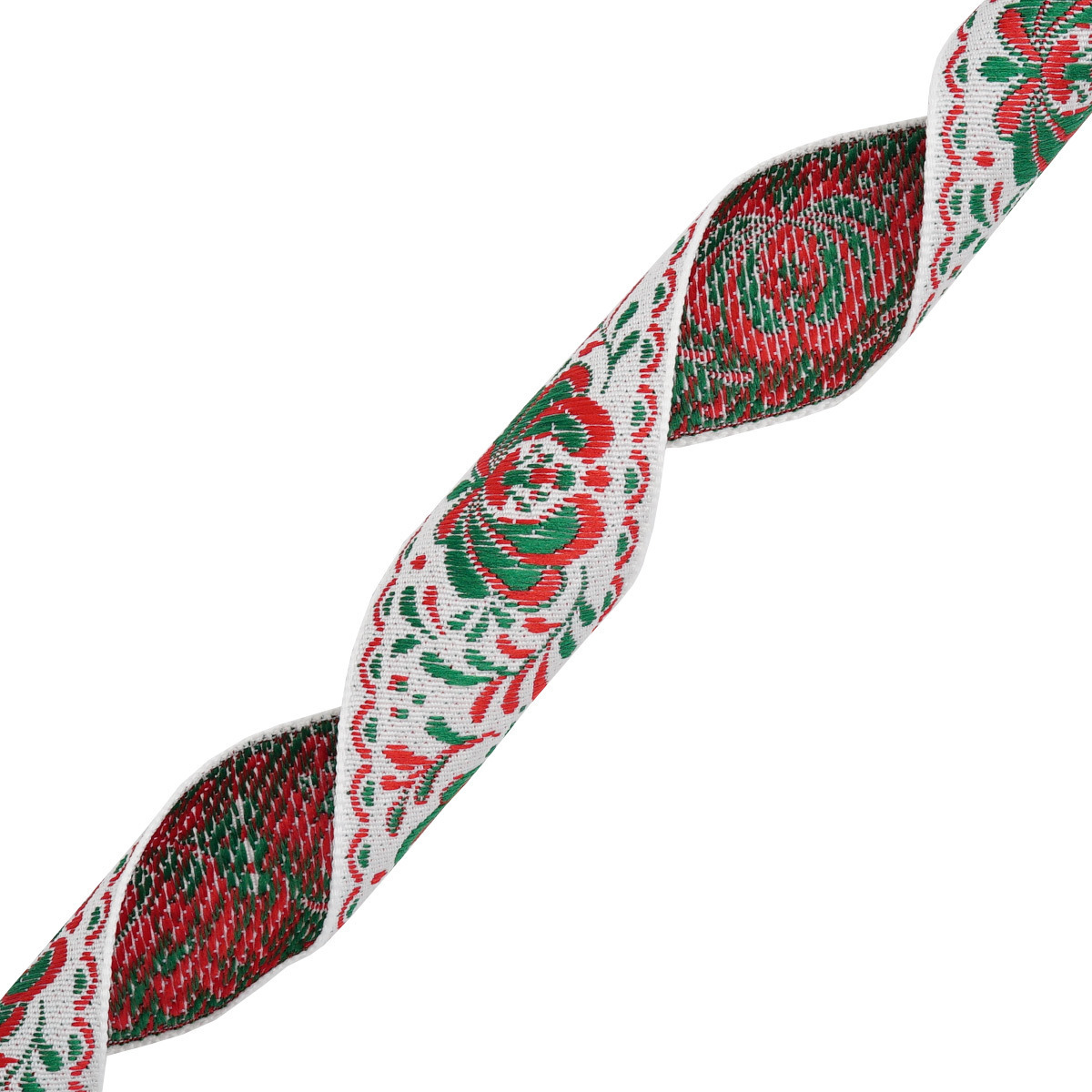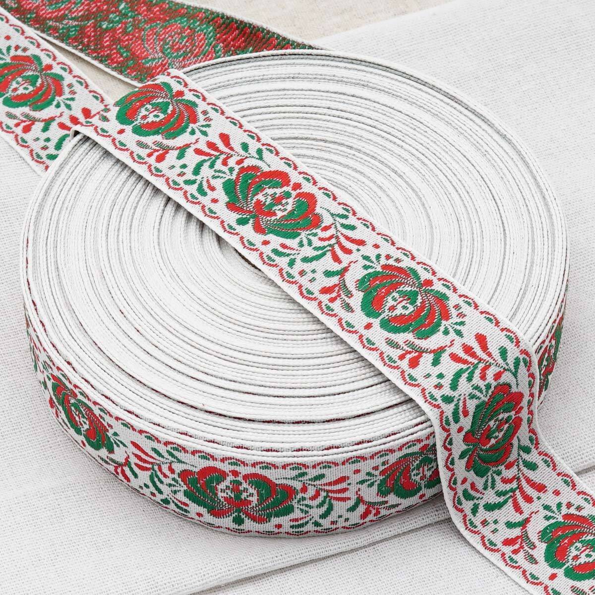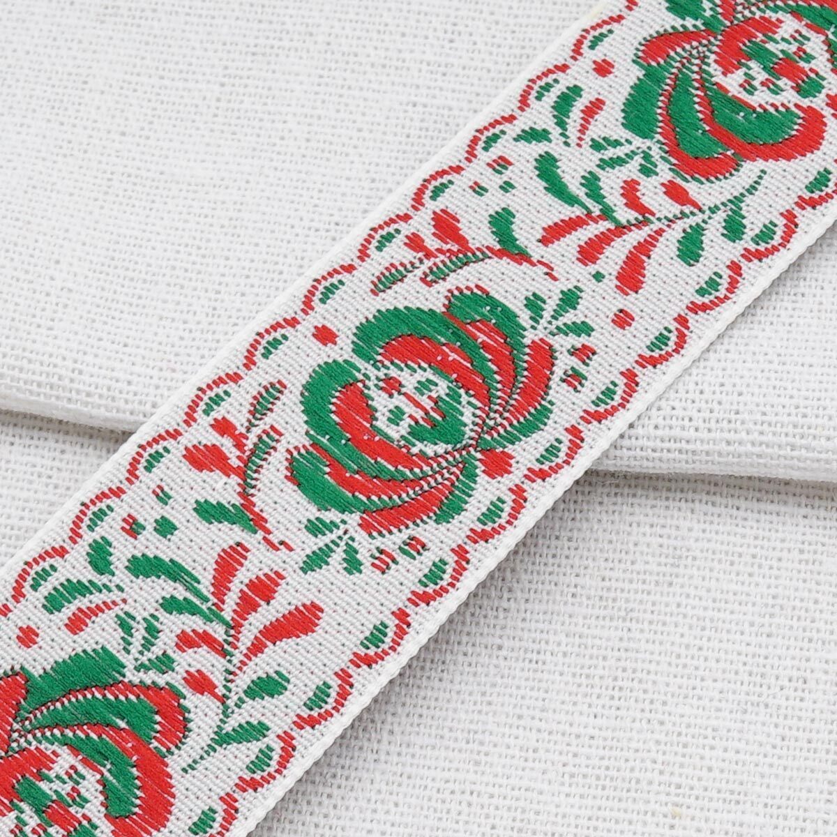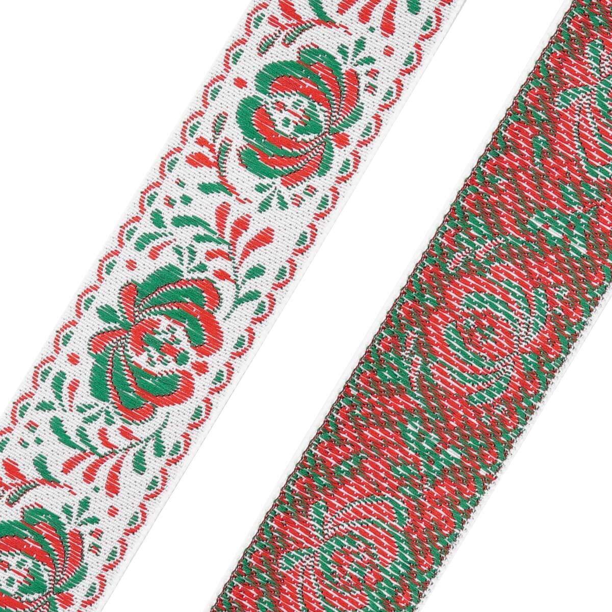Лента (тесьма) жаккардовая 32.0 мм / 25±1 метров, рис. 9581 Гжель, (4 белый/красный/зеленый) С1853Г17
