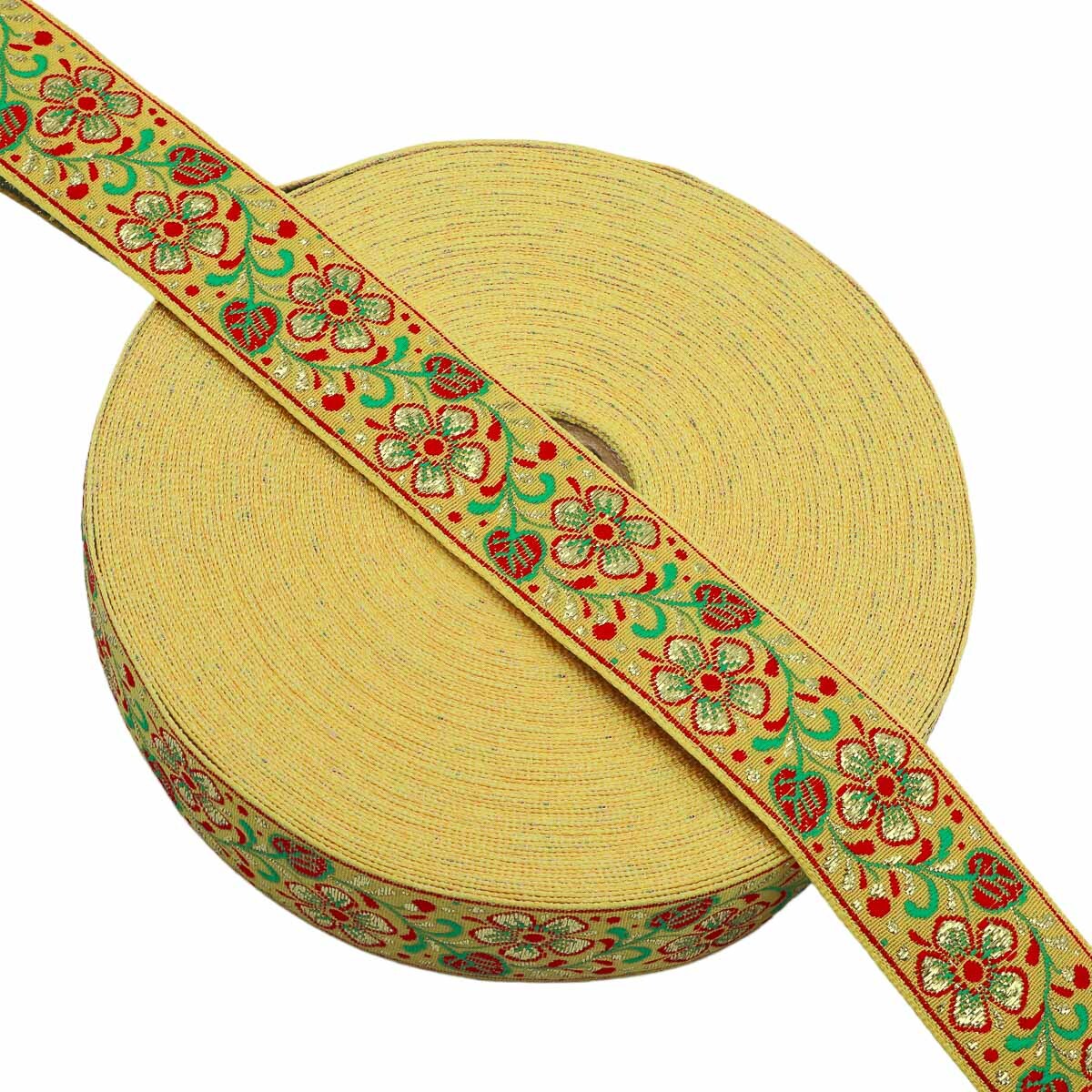 Лента (тесьма) жаккардовая 32.0 мм / 25±1 метров, с метанитом рис. 9565 Яблоневый цвет (2 желтый) С3104Г17
