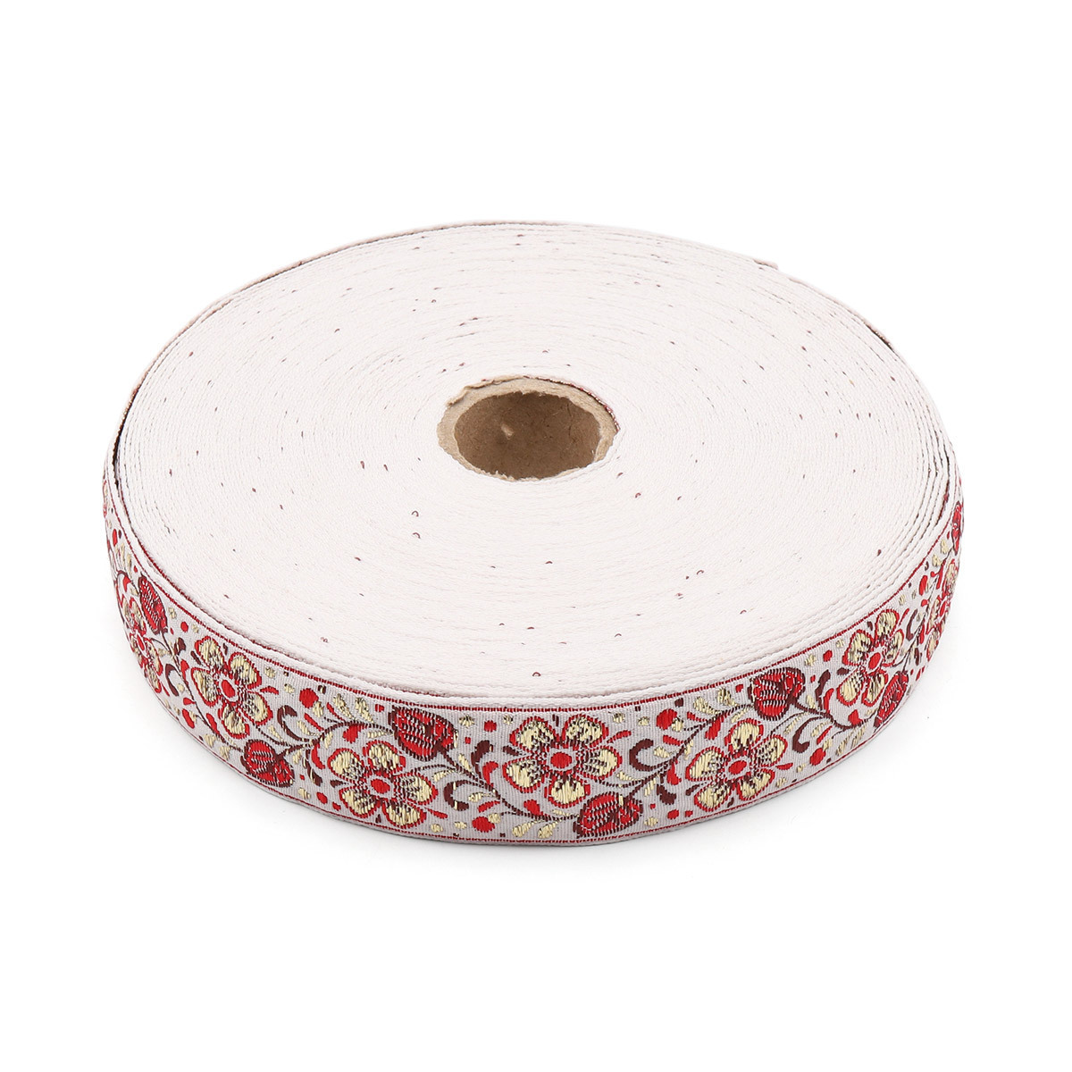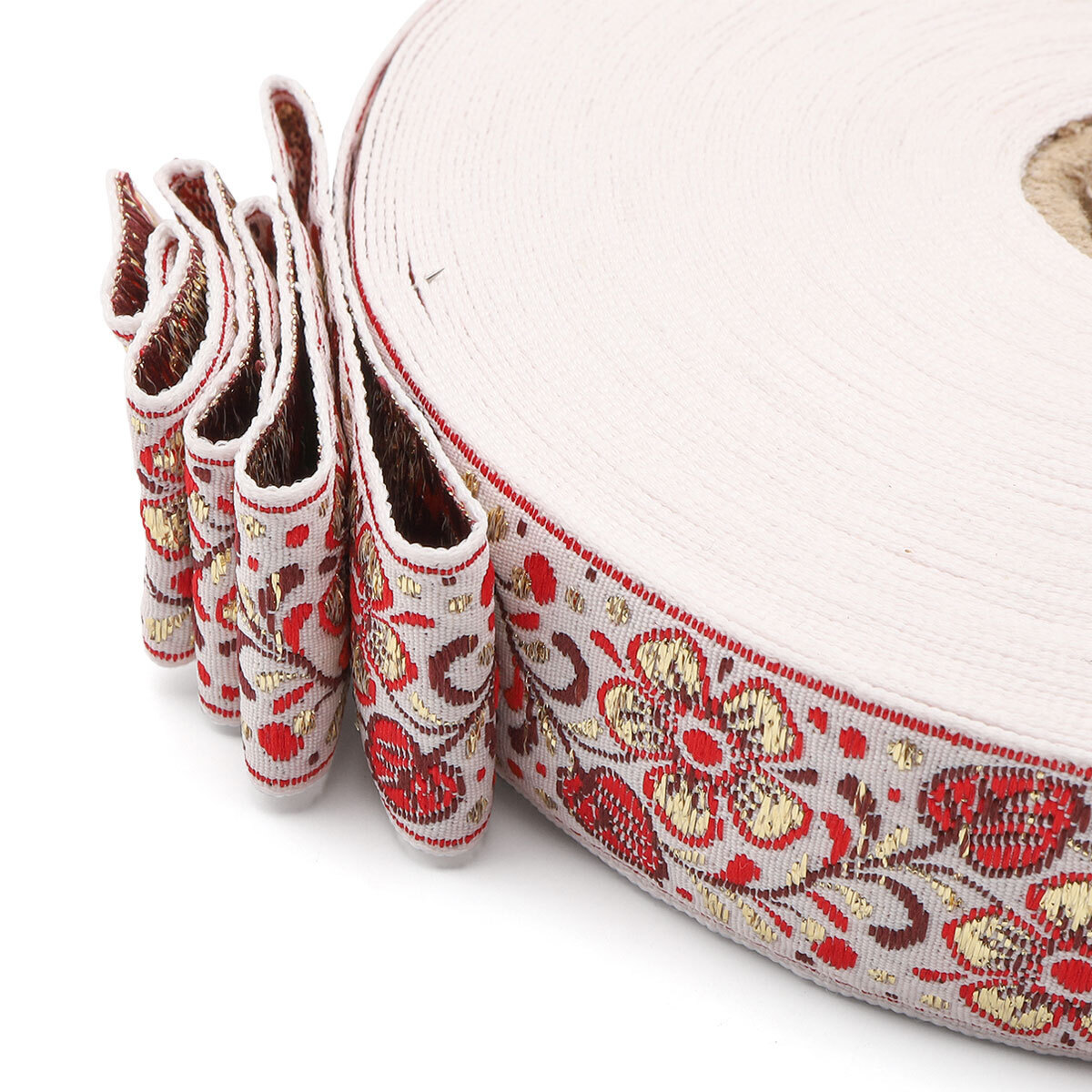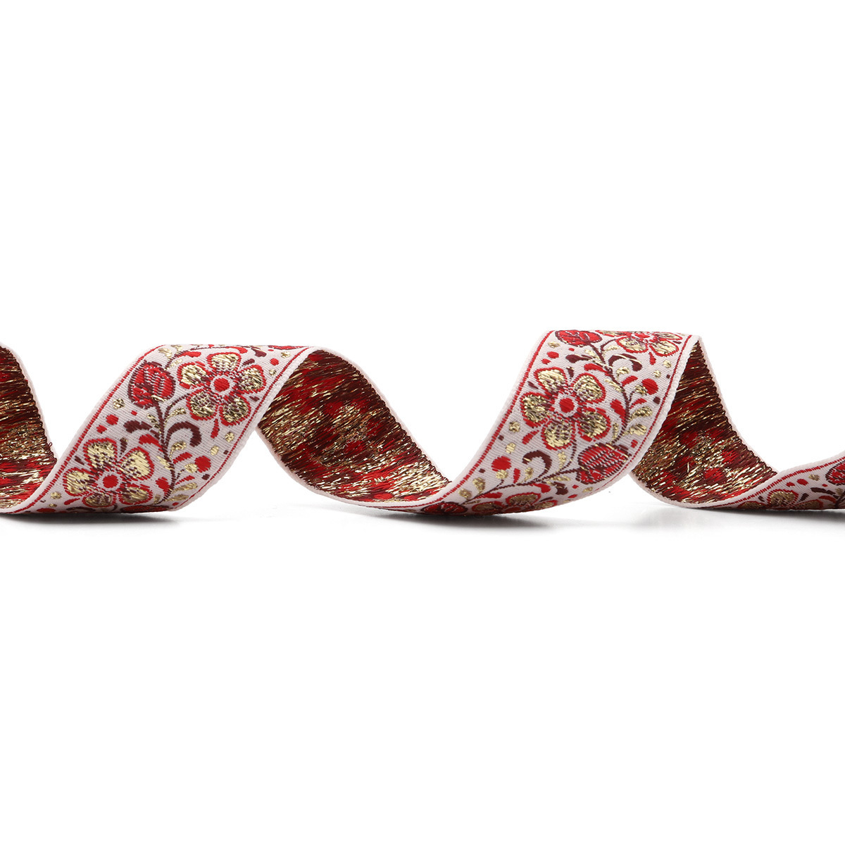 Лента (тесьма) жаккардовая 32.0 мм / 25±1 метров, с метанитом Яблоневый цвет, рис. 9565 белый / золотой / красный, С3104Г17