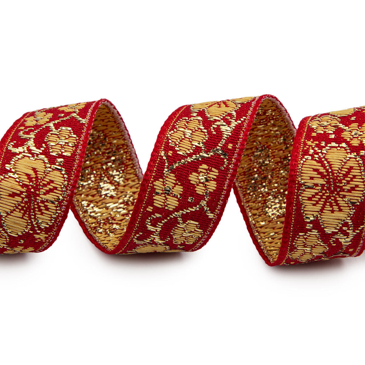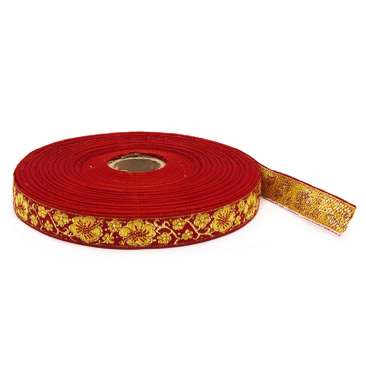Лента (тесьма) жаккардовая 18.0 мм / 25±1 метров, с метанитом рис. 9579 Яблоневый цвет (1 красный/желтый/золото) С1856Г17