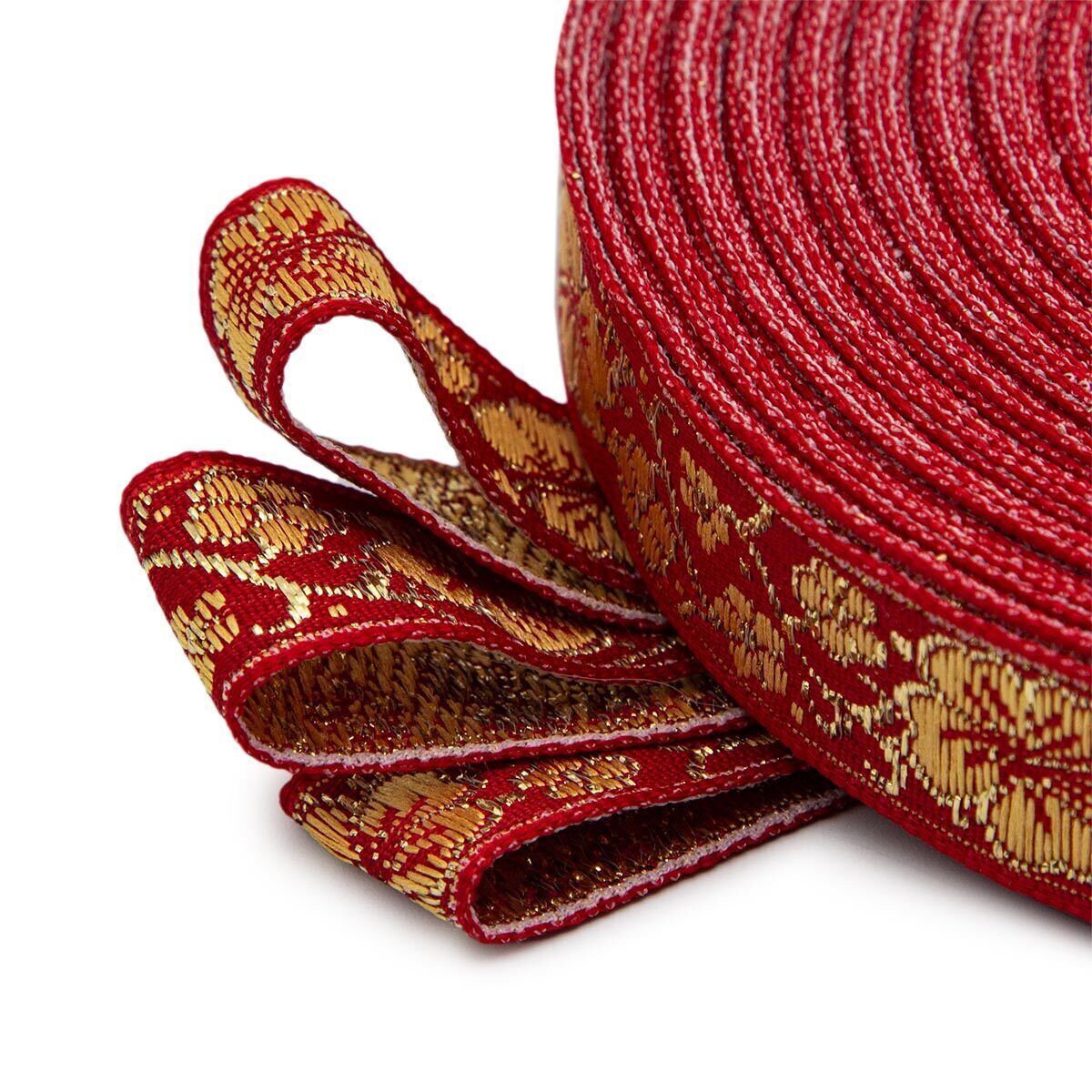 Жаккардовая лента имеет объемный плетеный узор, напоминающий вышивку. Поскольку рисунок образуется переплетением нитей, а не наносится на готовую ткань, он никогда не поблекнет и не сотрется. Металлизированные нити придают ленте нарядный блеск и торжественность. Применение: – украшение домашнего текстиля – покрывал, наволочек, мебельных чехлов; – отделка и ремонт предметов одежды, особенно одежды для выступлений; – такие ленты можно пришивать как ручки для сумок и рюкзаков, подвязок, подтяжек и ремней. Чтобы пришить жаккардовую ленту к материалу, используйте простую машинную строчку. Размер: ширина 18 мм, длина 25 м.