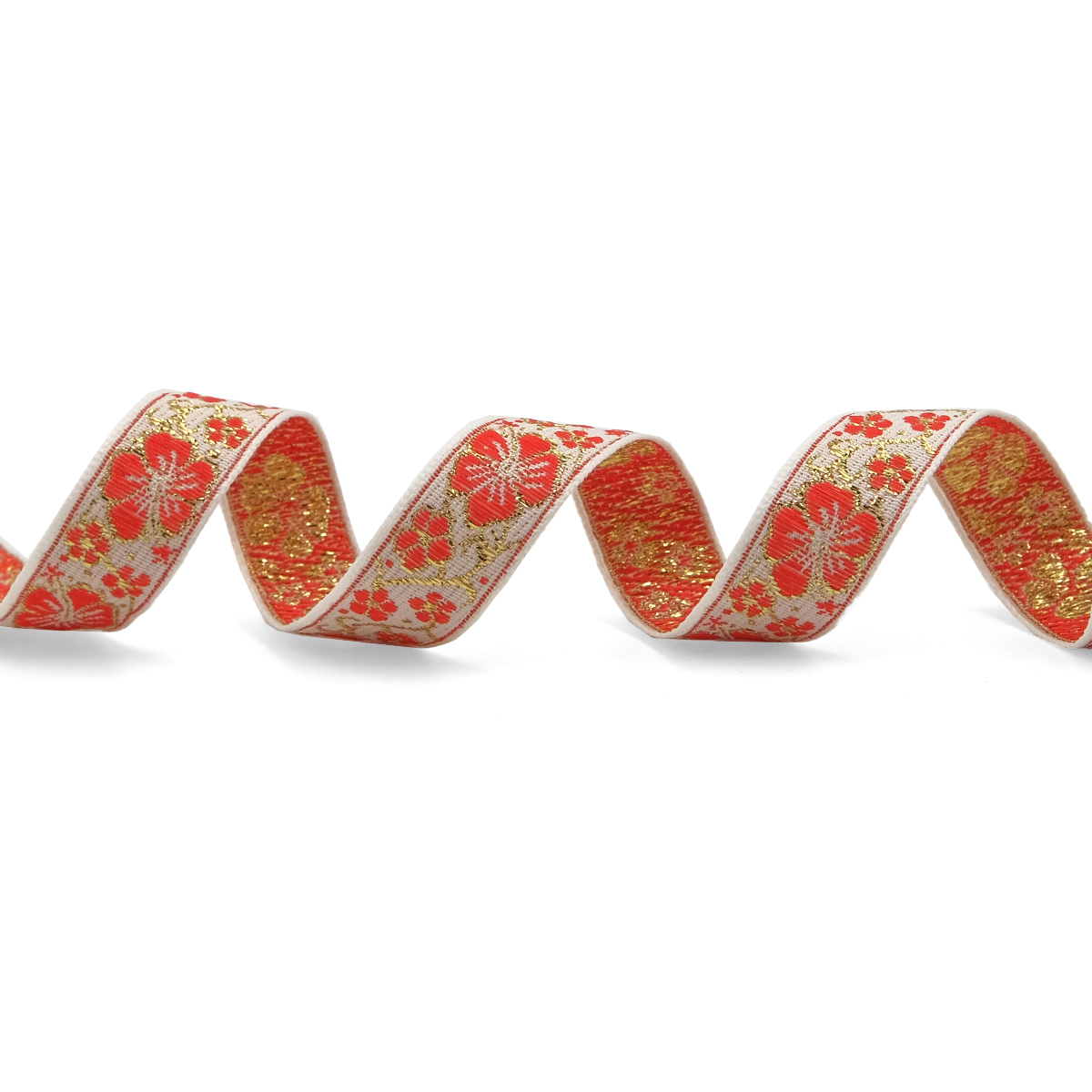 Лента (тесьма) жаккардовая 18.0 мм / 25±1 метров, с метанитом рис. 9579 Яблоневый цвет (9 белый/красный/золото) С1856Г17