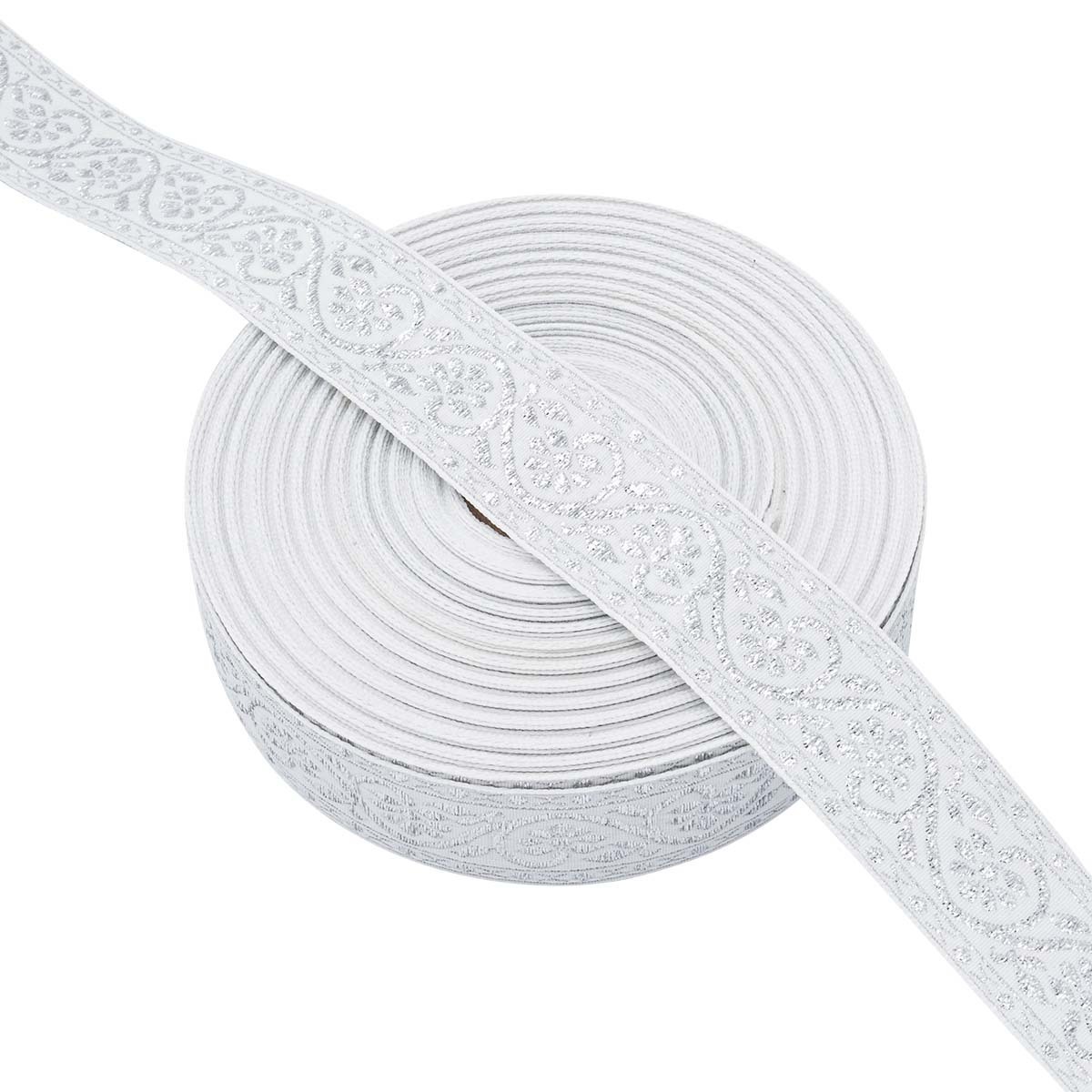 Лента (тесьма) жаккардовая 32.0 мм / 25±1 метров, с метанитом рис. 9819, белый/серебро, С3104Г17