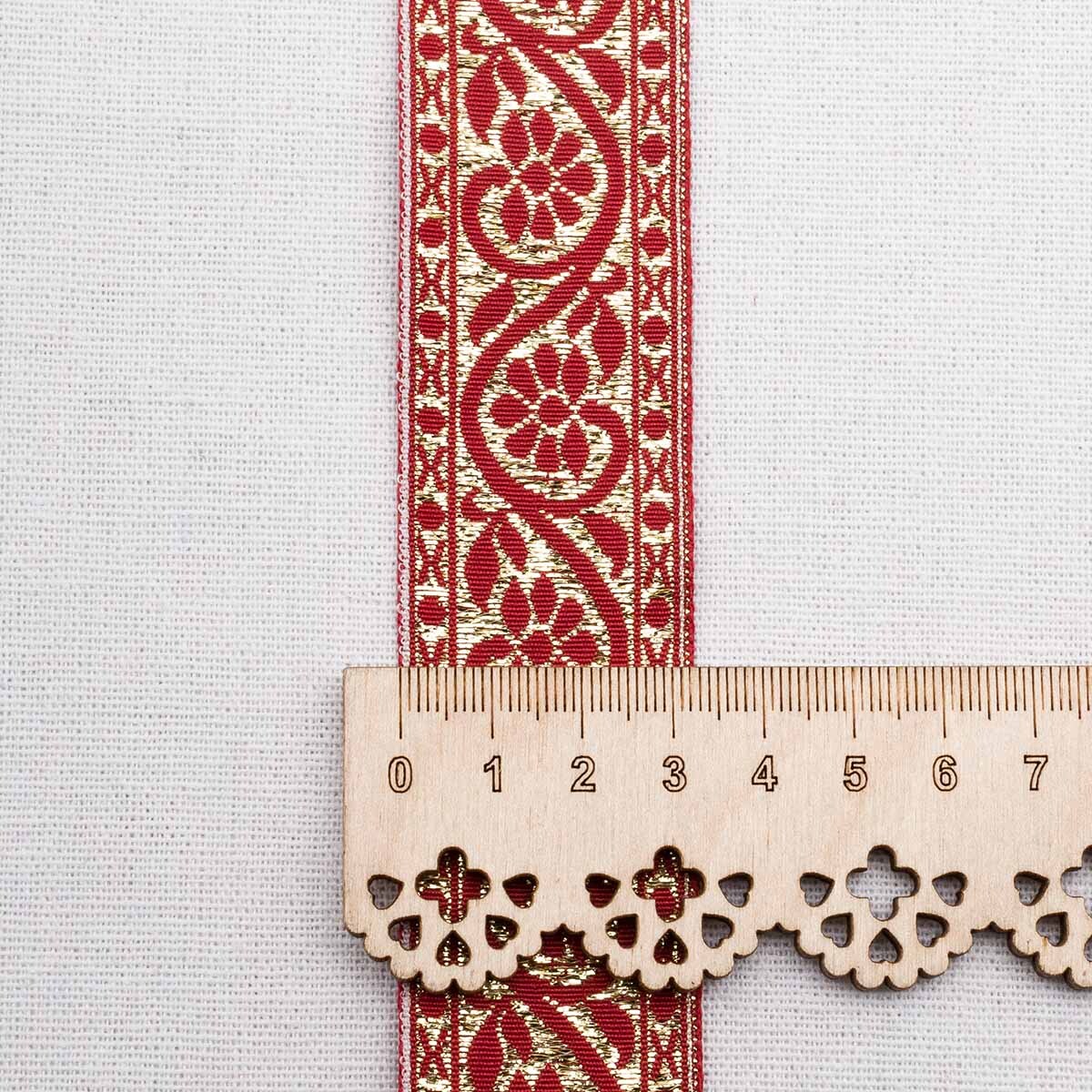 Лента (тесьма) жаккардовая 32.0 мм / 25±1 метров, с метанитом рис. 9819, красный/золото, С3104Г17