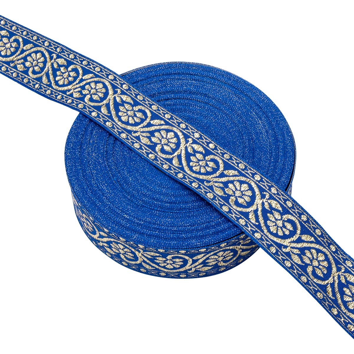 Лента (тесьма) жаккардовая 32.0 мм / 25±1 метров, с метанитом рис. 9819, синий/золото, С3104Г17