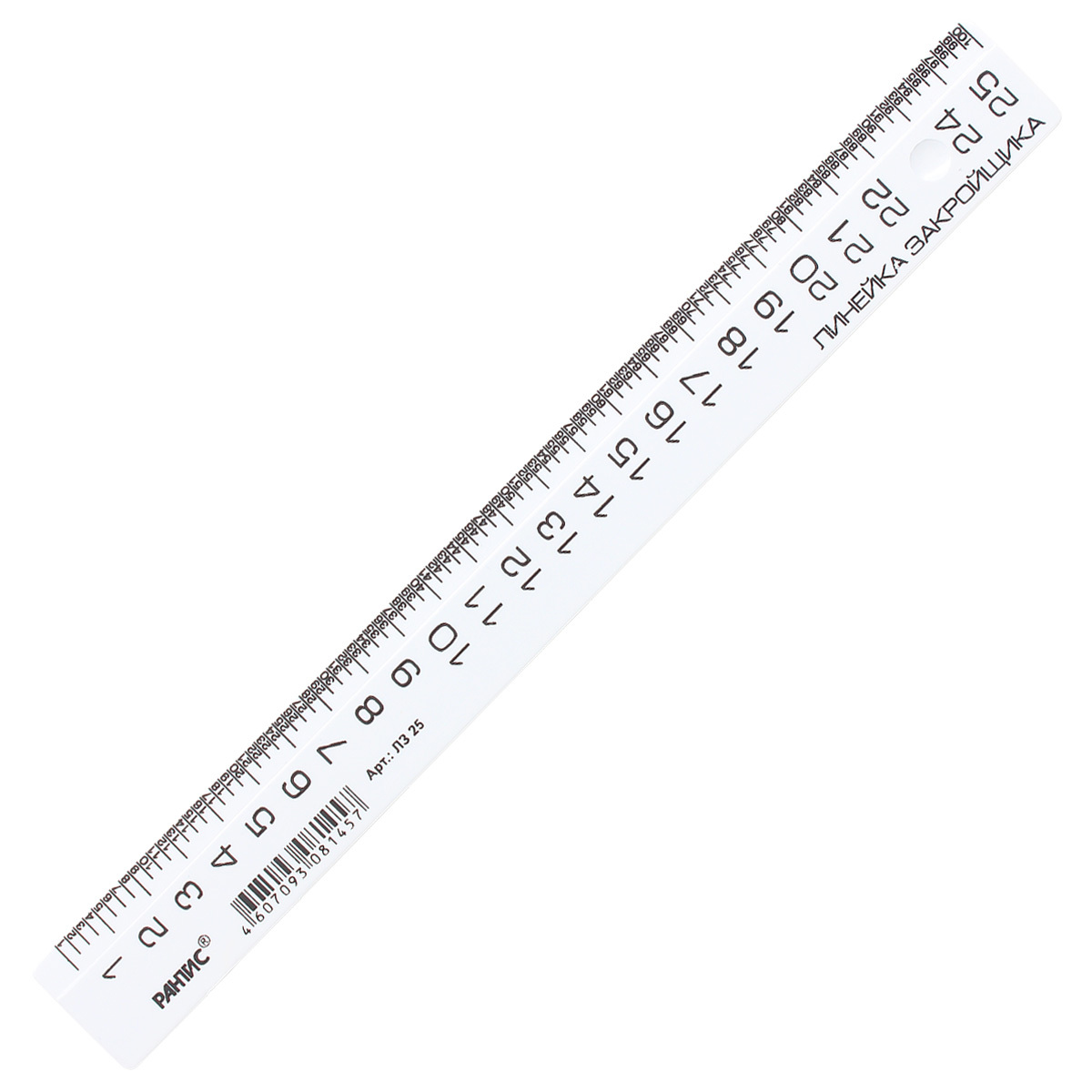 Линейка закройщика длиной 25 см имеет специальную шкалу, где каждый сантиметр поделен на 4 части. Такая шкала позволяет строить масштабируемые выкройки. Линейка пригодится тем, кто занимается разработкой моделей одежды, шитьем и ремонтом, а также рукоделием. Используйте эту линейку, чтобы: – строить выкройки, таблицы, чертежи; – создавать отрезы ткани, тесьмы, ленты подходящей длины; – подравнивать края листовых материалов – картона, фетра, бумаги. Линейка изготовлена из прозрачного пластика, поверхность гладкая. Толщина линейки 2 мм.