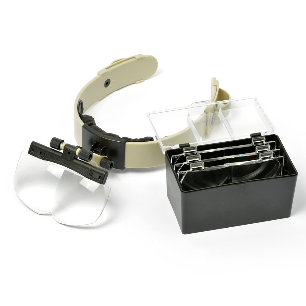 Лупа с креплением на голову со сменными линзами. В набор входят 4 различные трехмерные линзы со степенями увеличения 1.2х, 1.8х, 2.5, 3.5х. Длину крепления можно отрегулировать в зависимости от размера головы.