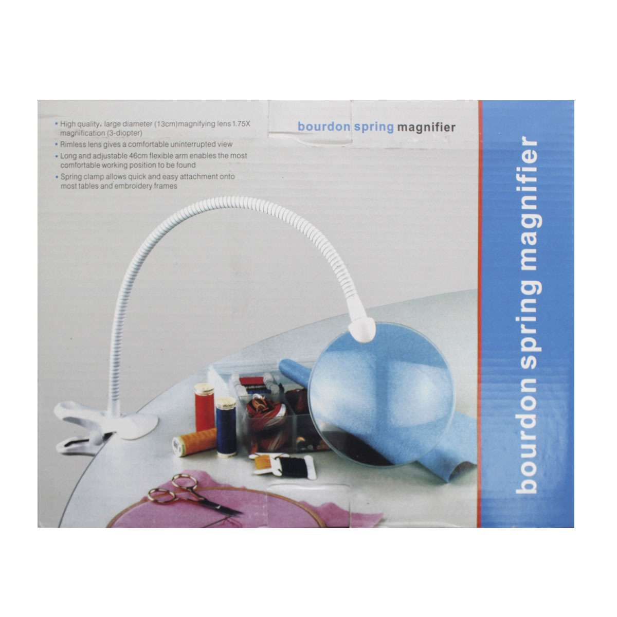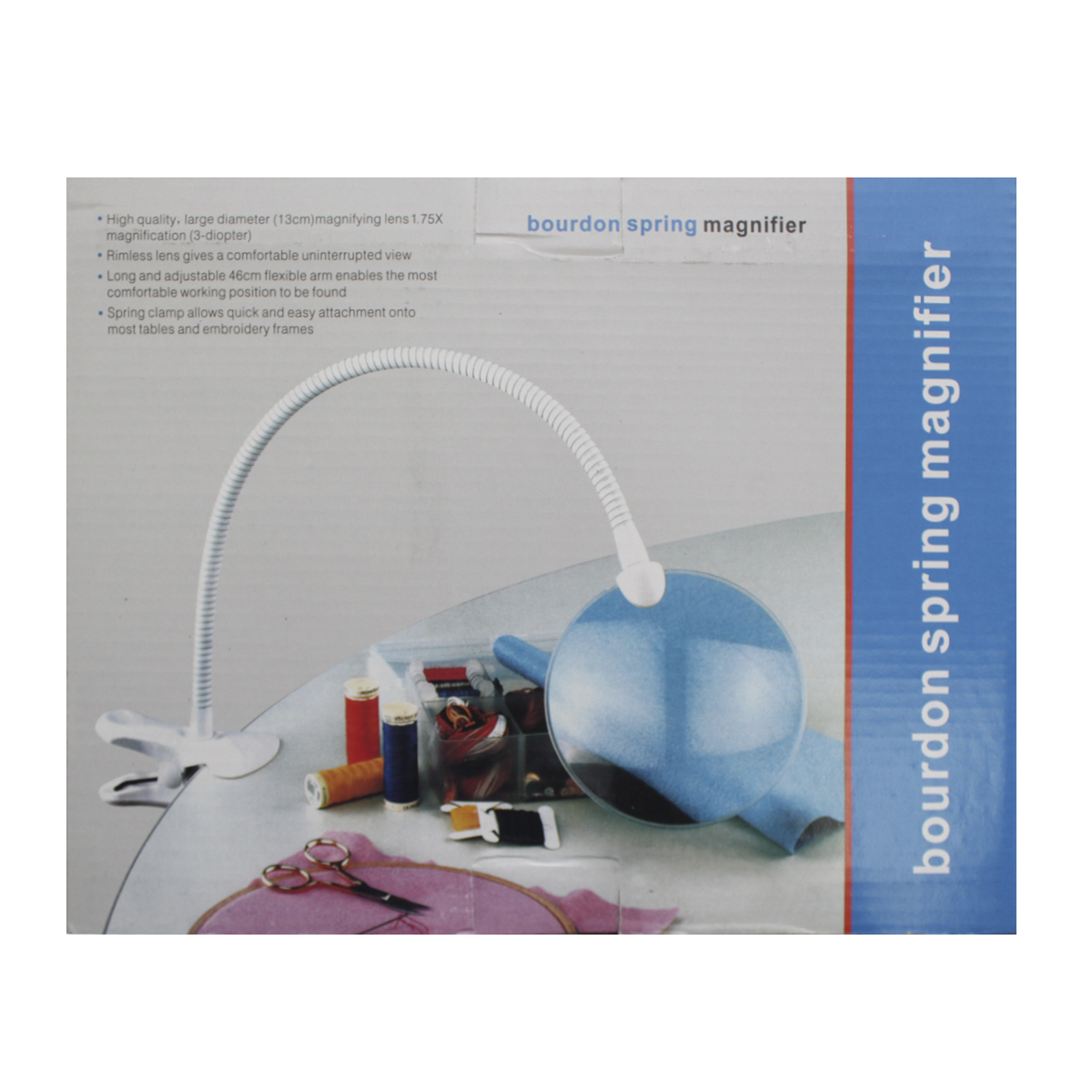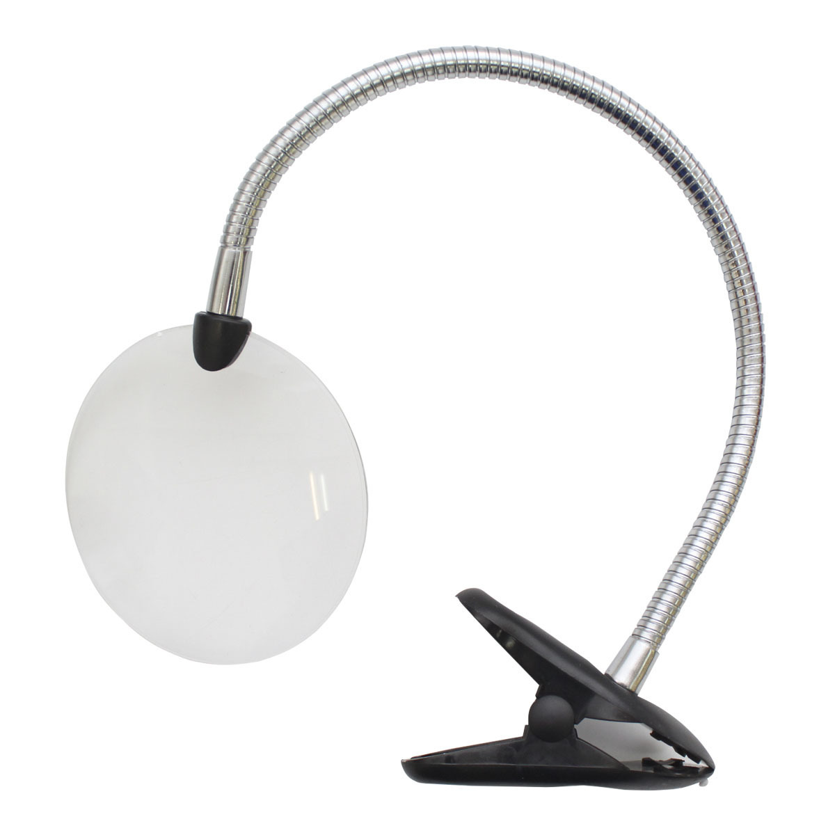 Пластиковая лупа на гибком металлическом штативе. Штатив позволяет регулировать положение линзы под желаемым углом. Без встроенной подсветки. Лупа фиксируется на крае стола, рамке для вышивания и другой рабочей поверхности. Подходит для поверхностей толщиной не более 6 см. Используйте при вышивании нитками или бисером, плетении украшений, сборке механизмов или конструкторов, изготовлении бижутерии и другой мелкой работе. Диаметр линзы – 13 сантиметров, длина гибкого штатива – 46 сантиметров. Коэффициент увеличения изображения – 1,75Х.